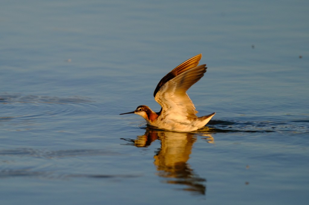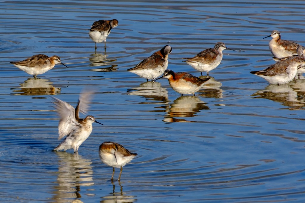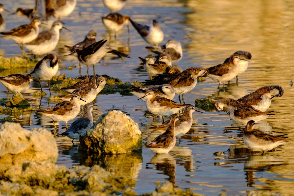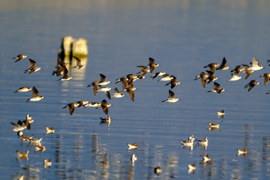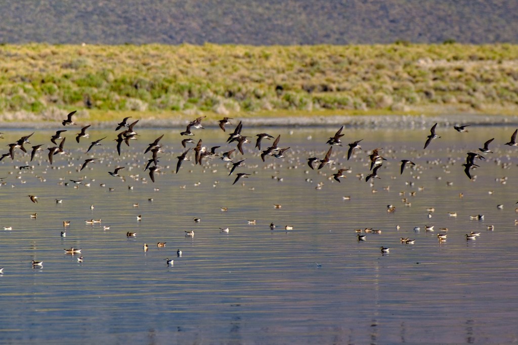 These shorebirds birds are 9 inches long, have a wingspan of 17 inches, and weigh 2 oz. They mate in the Dakotas and Saskatchewan in May. The females lay eggs and promptly leave, heading south to the saline lakes of the Great Basin: Great Salt Lake, Abert’s Lake in Oregon, and Mono Lake north of Bishop. The males look after the eggs, but once the chicks are hatched, the males also head south. The chicks are born with feathers and find their own food; soon they also go south. The birds show up at Mono Lake from mid-June to August. Surveys at Mono Lake done 35 years ago estimated up to 80,000 phalaropes in a year, but survey methods then and now are pretty crude. The females arrive first, then males, then juveniles. They hang out for a month doubling their weight on brine shrimp and alkali flies — an unlimited, but monotonous, buffet. They use the time and food energy to molt, discarding their old feathers and growing new ones. Then they fly south – a 3-day non-stop to South America, about 3000-4000 miles. They spend the Boreal winter at inland saline lakes near the Andes Mountains of Argentina, Bolivia, and Chile. In spring of the next year, they fly north and do this all over again.
