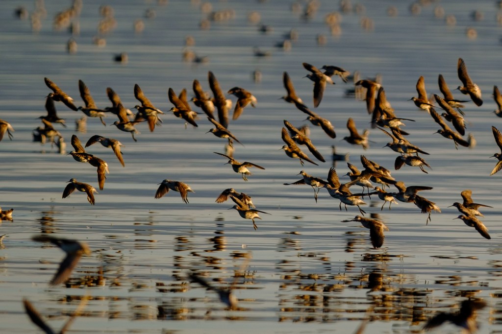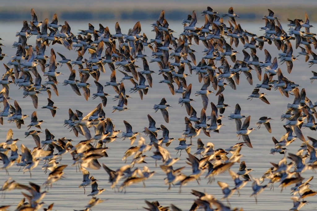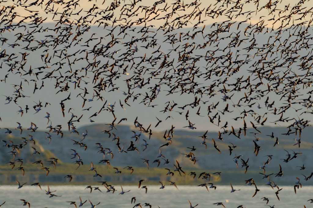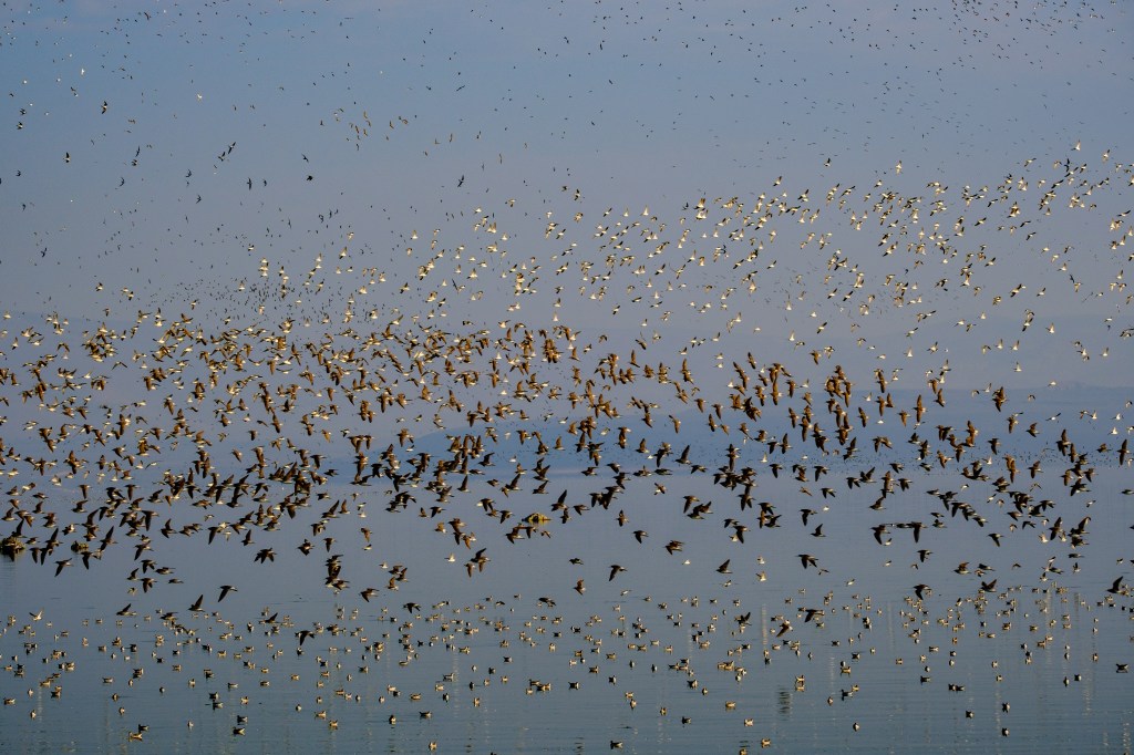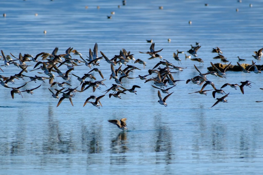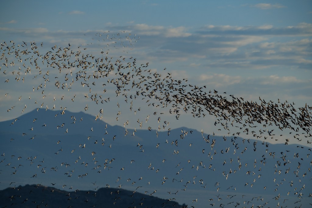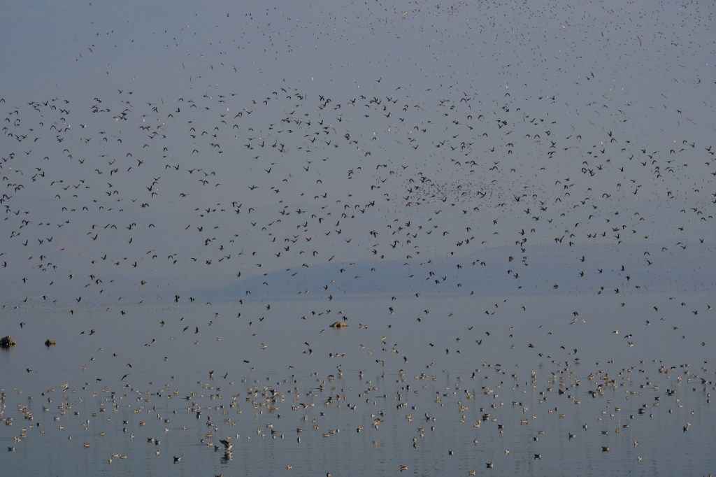 Every few minutes a flock of hundreds or thousands took off, zoomed about (at speeds up to 50 mph) near the water surface or high above the water, and then landed on the water. Large flocks made a “whooshing” sound as they went past. The landings looked like a controlled crash; the birds spread their wings, put out their feet, and take several steps on the water before flopping down. Their bellies are white, backs are a mix of browns. So depending on their angle in flight, they make look white, brown, grey, or black. As they change direction, the color of the flock changes — a fast moving plume of black smoke seems to turn white. Sometimes a dark-appearing flock crosses the path of another flock that looks white.