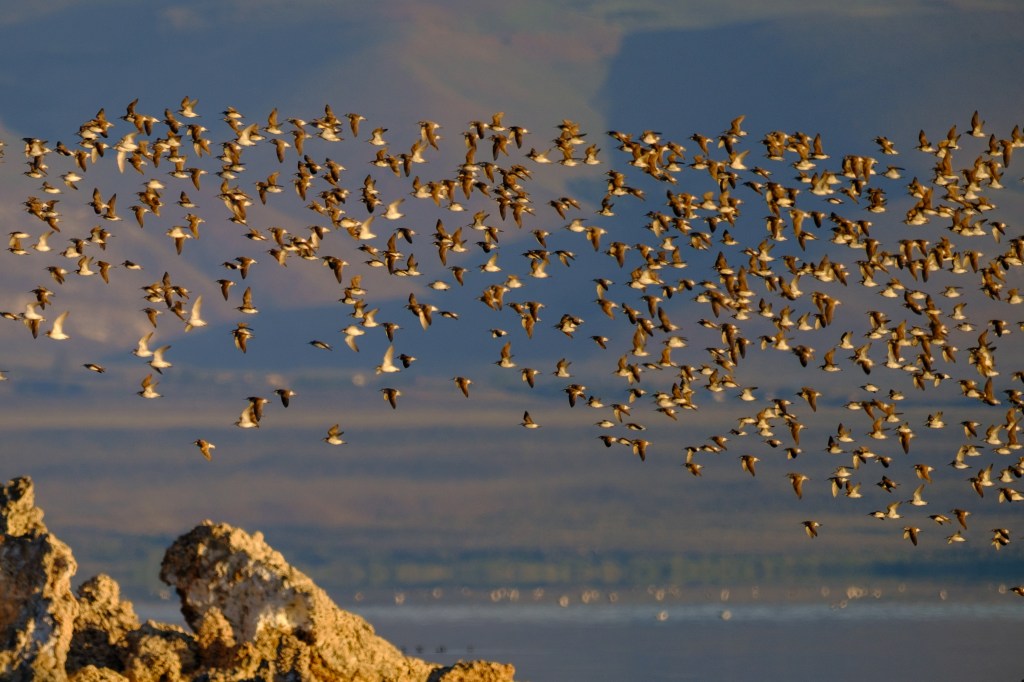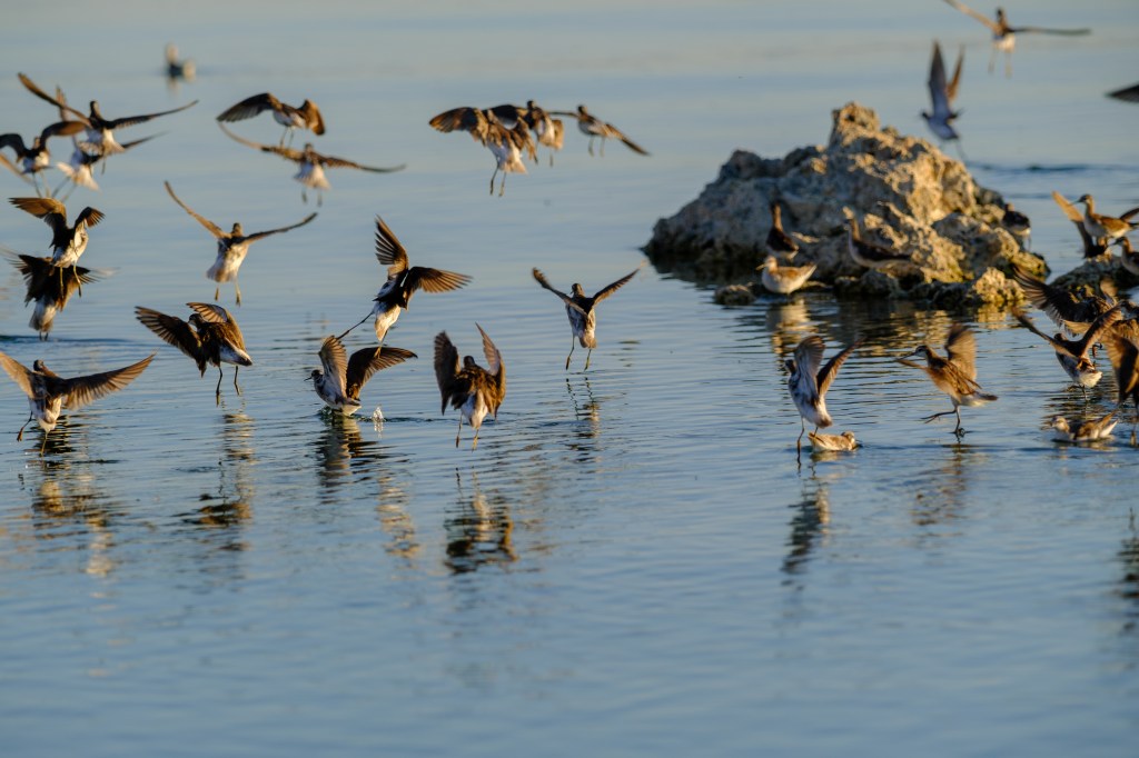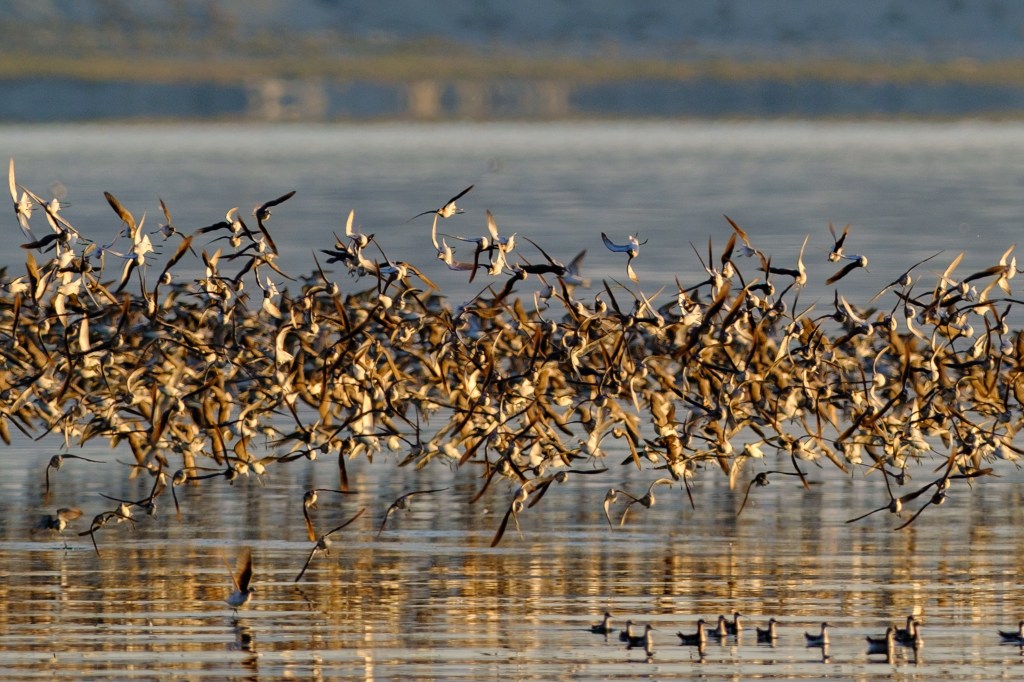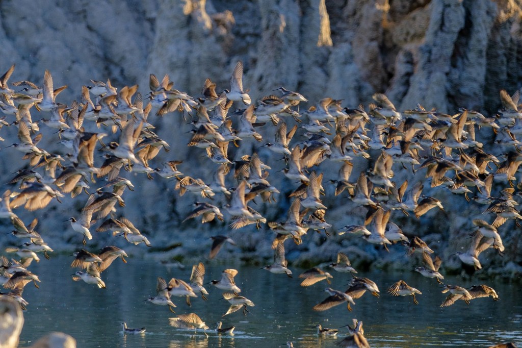 Until 2021, I knew nothing about this bird. Roberta and I visited Mono Lake’s South Tufa beach early on July 2 and found thousands of them at the shore, floating on the water, and flying about in flocks of hundreds, even thousands. We came back on July 6 and 13 to get more photos. The birds made little noise; just faint gurgling sounds. At the shore they seemed restless, either eating or preening themselves. The scene was one of the most exciting wildlife events I’ve ever seen, comparable to seeing animal herds on the Serengeti.