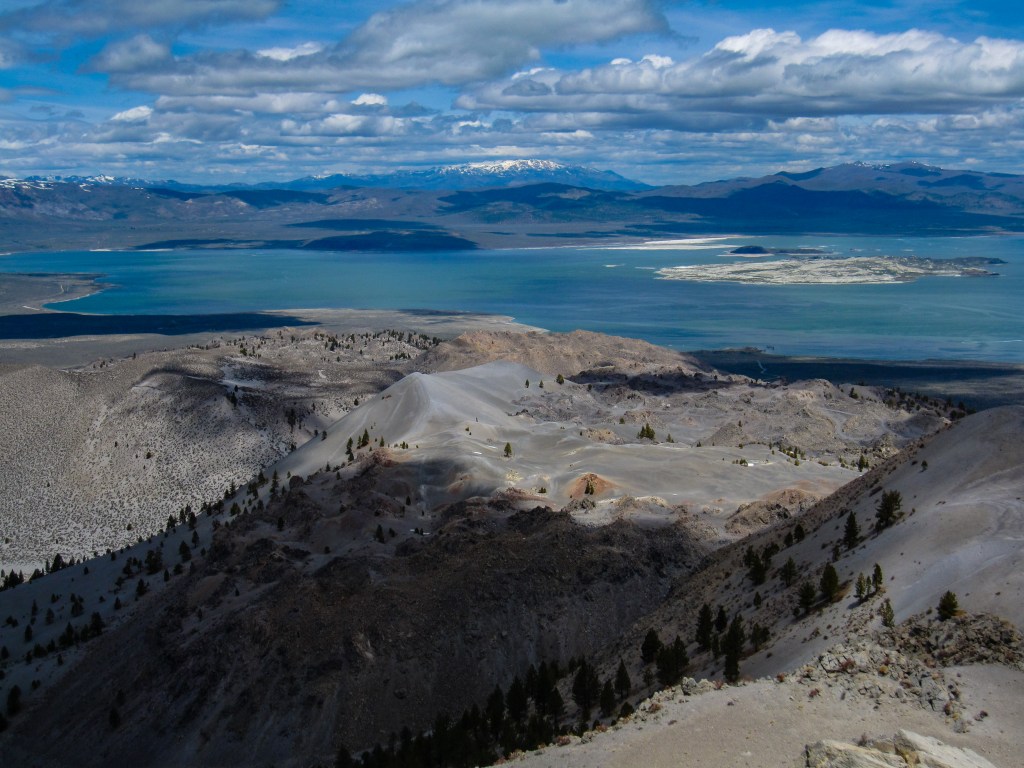 Below are photos of Mono Lake, where thousands of Phalaropes gather every summer. The first photo was taken from the Mono Craters, a group of volcanos south of the lake. In the foreground is volcanic ash and rubble. In the middle distance on the right is an island called Paoha. Most California Gulls migrate from the coast to this island in the summer, nest, and raise their chicks. In the far distance are the snowy summits of the Sweetwater Mountains, which straddle the California-Nevada border.