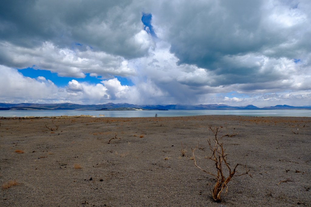 The winter view below, looking south, shows the Lake from near Conway Summit. The large road is Highway 395. The town of Lee Vining is in the distance on the right. Rain and snow are coming down from the clouds.