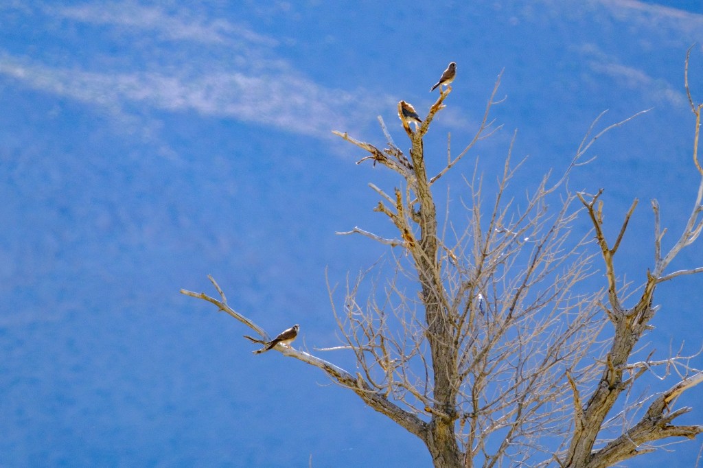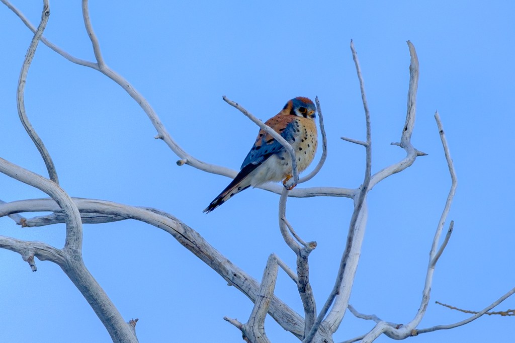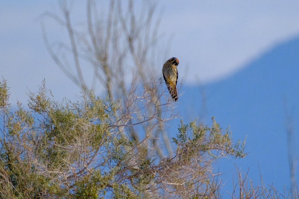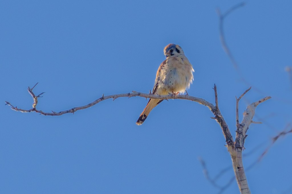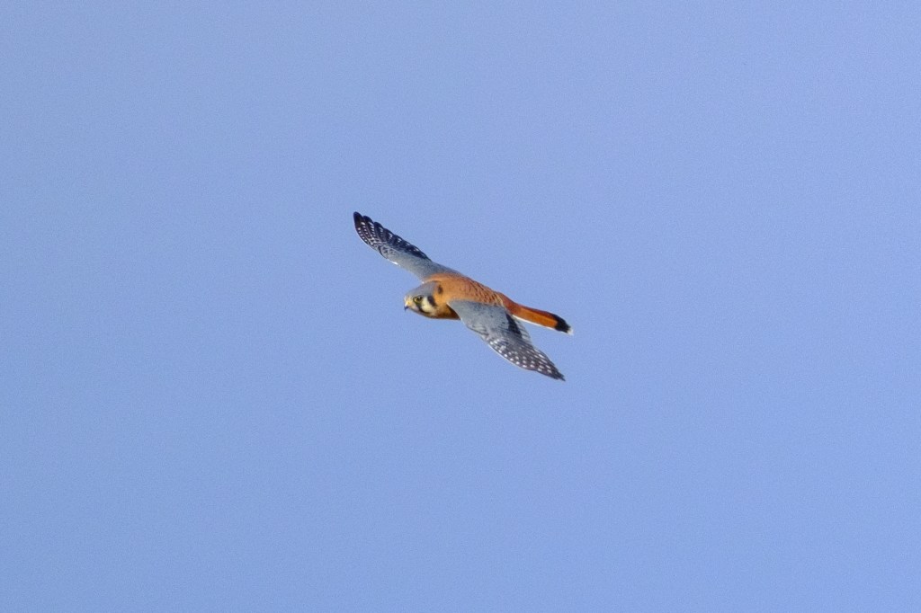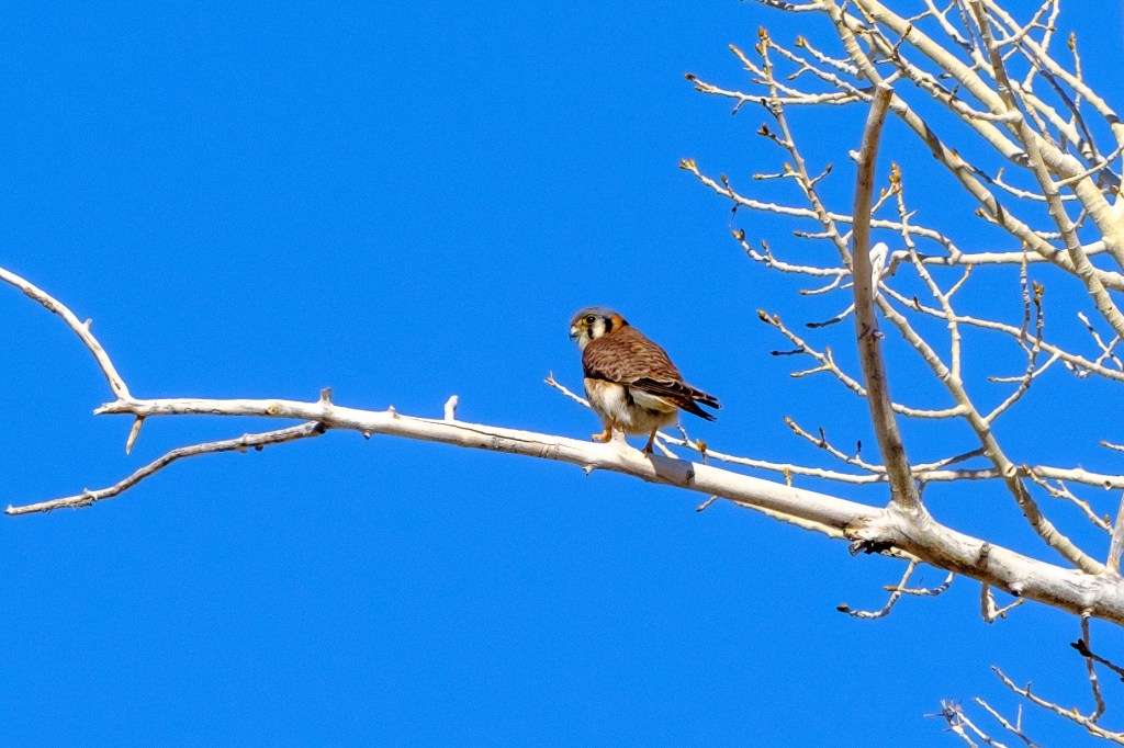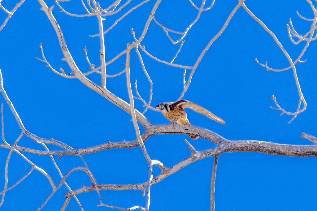 Kestrels are tiny falcons, just 9” long with a wingspan of 22”, weight 4 oz. When perched, they can be mistaken for a Dove, a Shrike, or even a Blackbird. I did not start to identify Kestrels until I bought a telephoto lens and started collecting pictures in 2020. Thanks to the camera, I now realize that the Bishop area is infested with American Kestrels. They hang out on trees near fields and sagebrush flats. They like to stand on naked branches, from which they hunt insects, lizards, mice, and small birds.