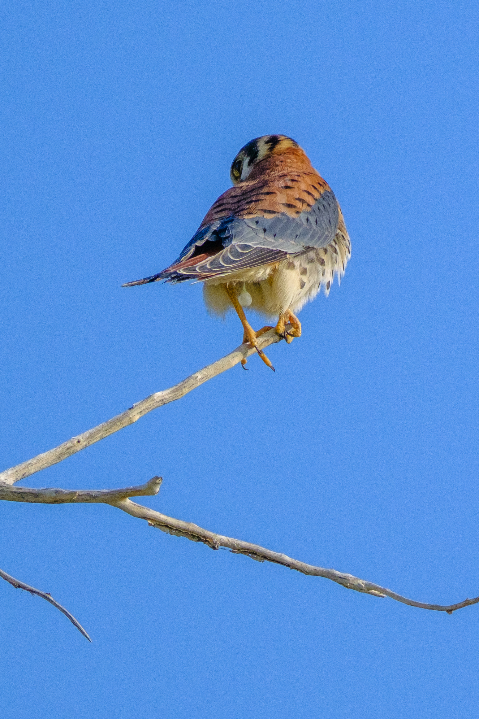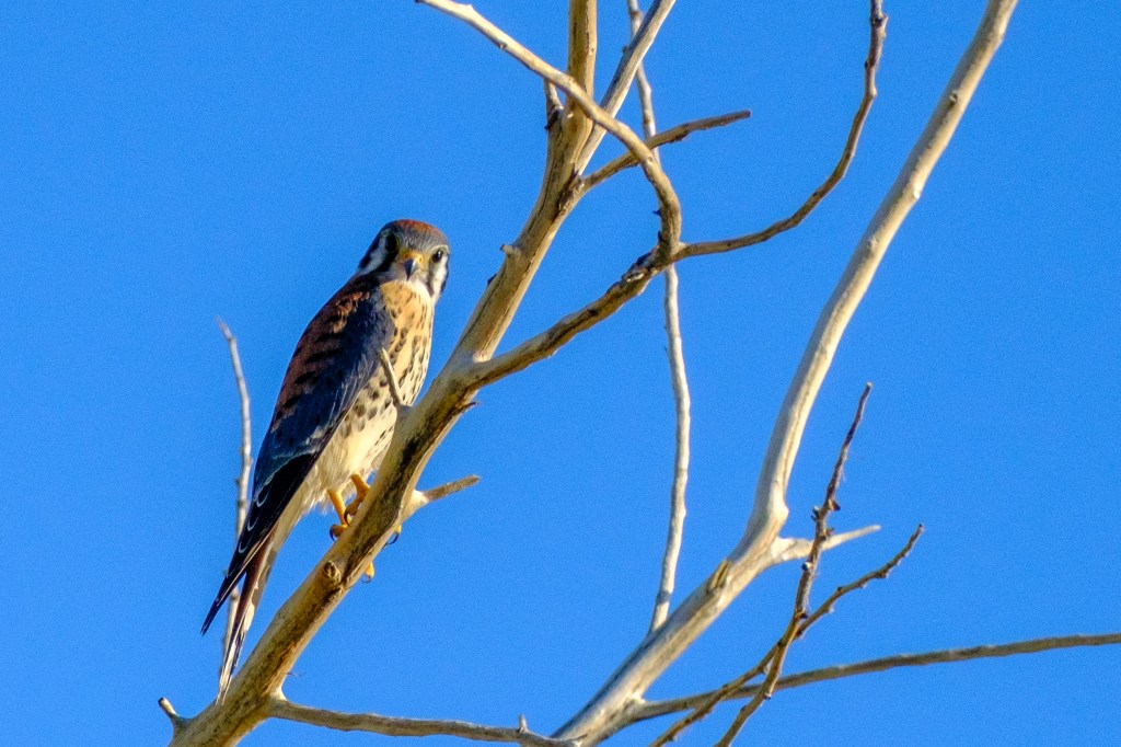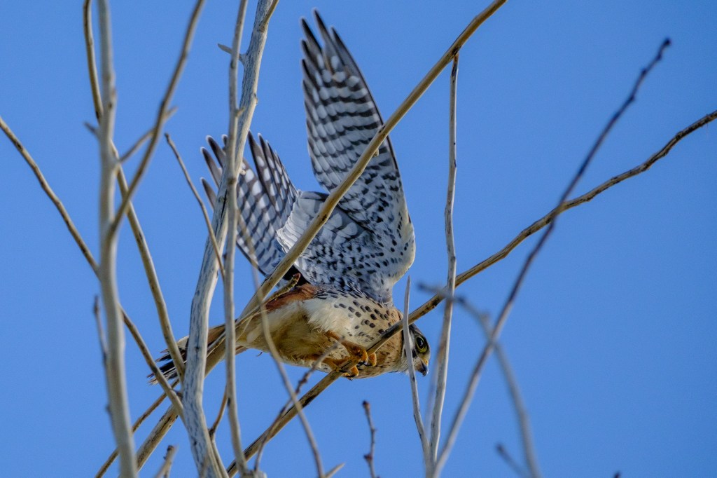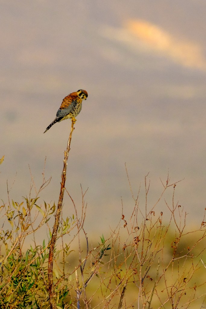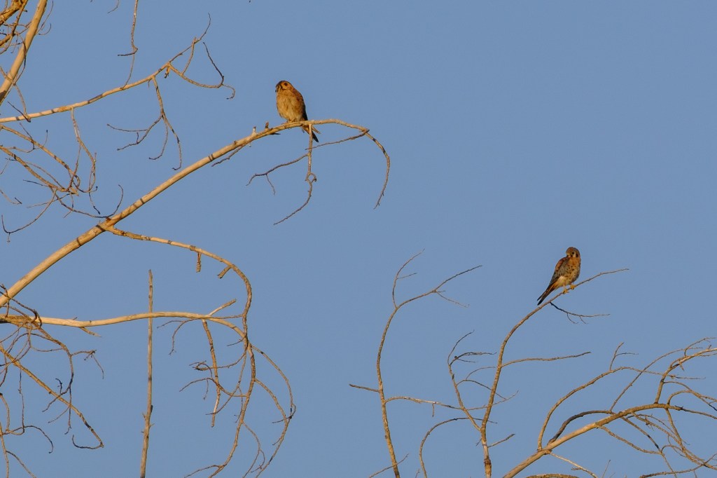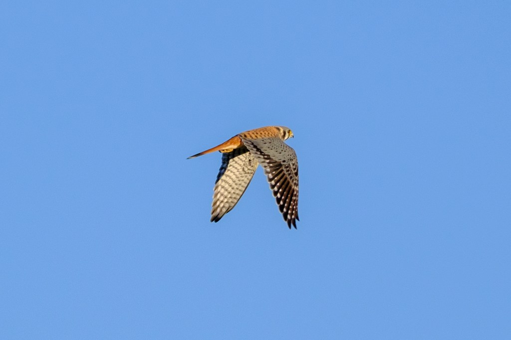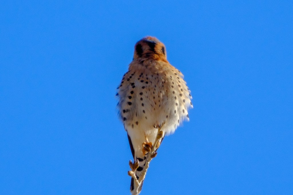 Kestrels are tiny falcons, just 9” long with a wingspan of 22”, weight 4 oz. When perched, they can be mistaken for a Dove, a Shrike, or even a Blackbird. I did not start to identify Kestrels until I bought a telephoto lens and started collecting pictures in 2020. Thanks to the camera, I now realize that the Bishop area is infested with American Kestrels. They hang out on trees near fields and sagebrush flats. They like to stand on naked branches, from which they hunt insects, lizards, mice, and small birds.