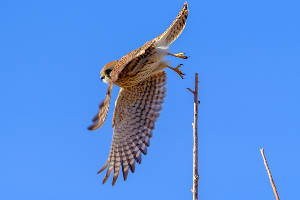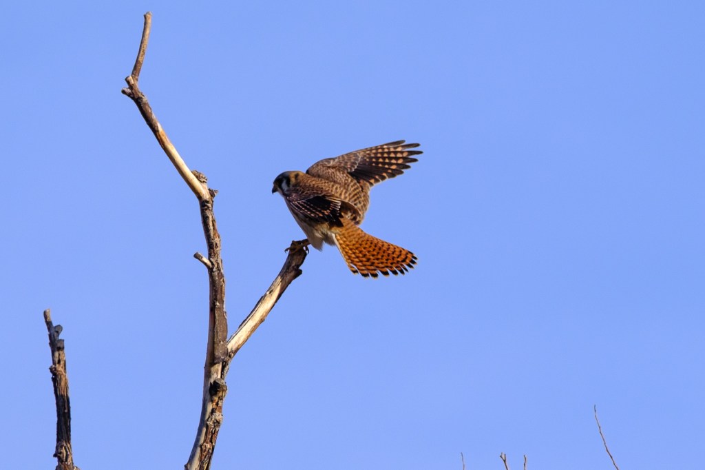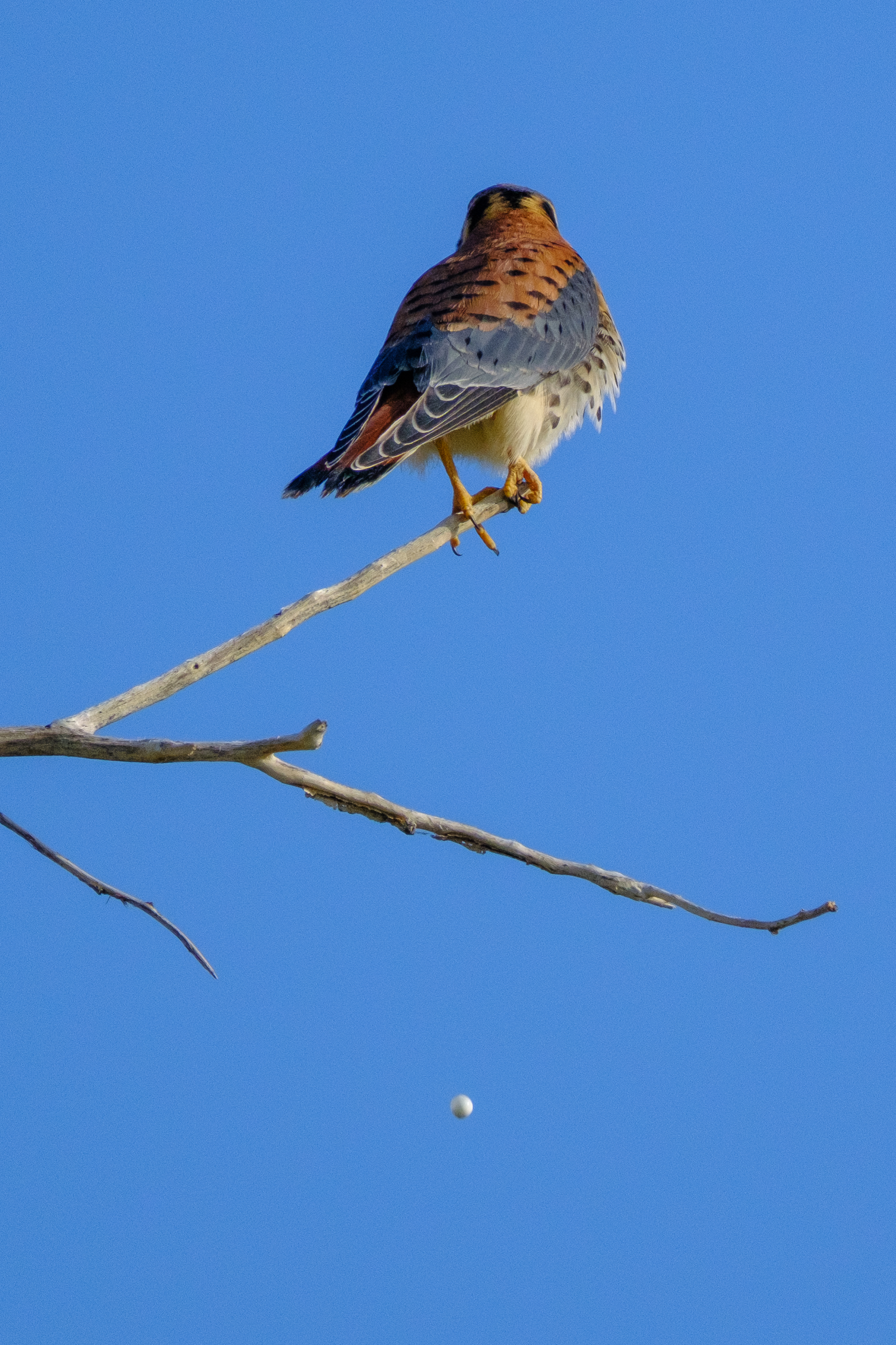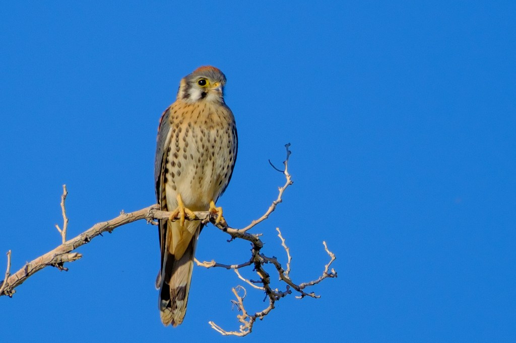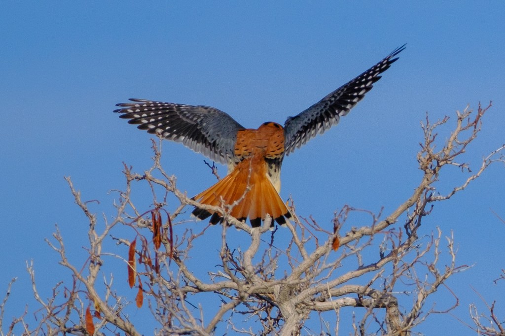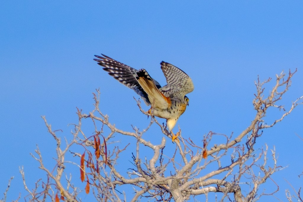 Kestrels are tiny falcons, just 9” long with a wingspan of 22”, weight 4 oz. When perched, they can be mistaken for a Dove, a Shrike, or even a Blackbird. I did not start to identify Kestrels until I bought a telephoto lens and started collecting pictures in 2020. Thanks to the camera, I now realize that the Bishop area is infested with American Kestrels. They hang out on trees near fields and sagebrush flats. They like to stand on naked branches, from which they hunt insects, lizards, mice, and small birds.