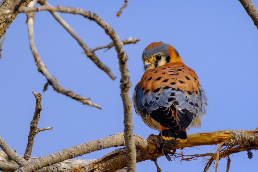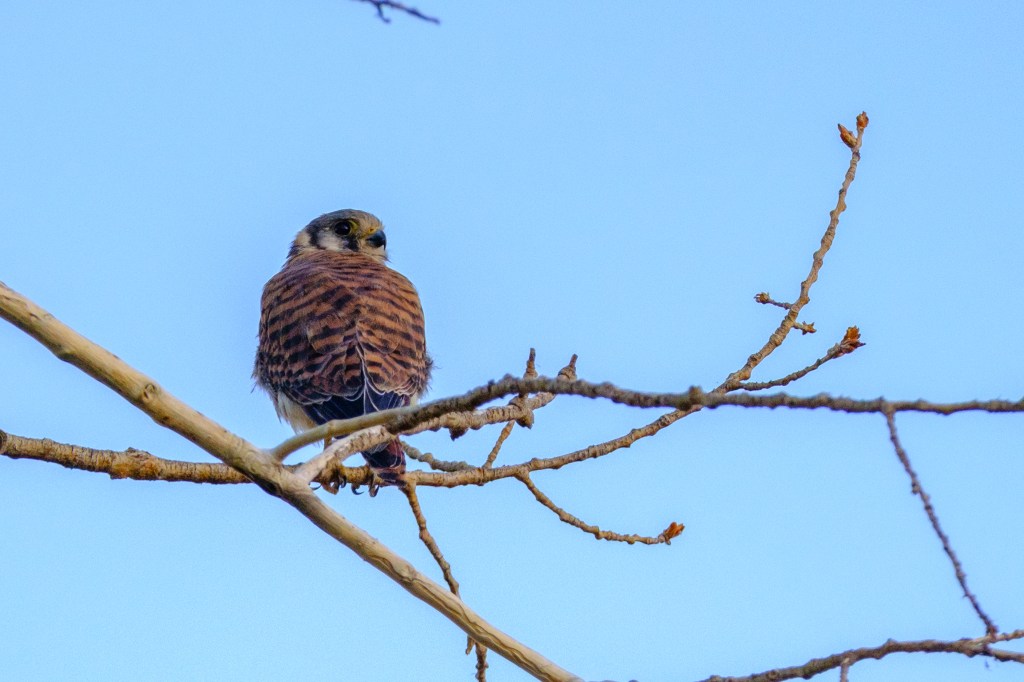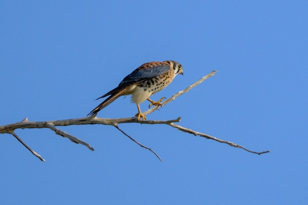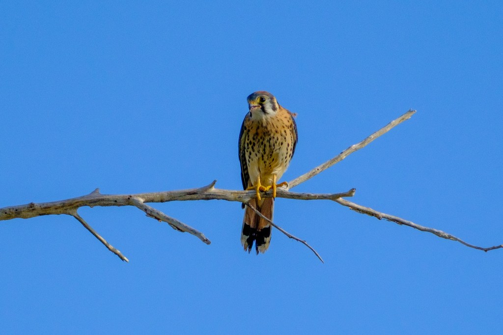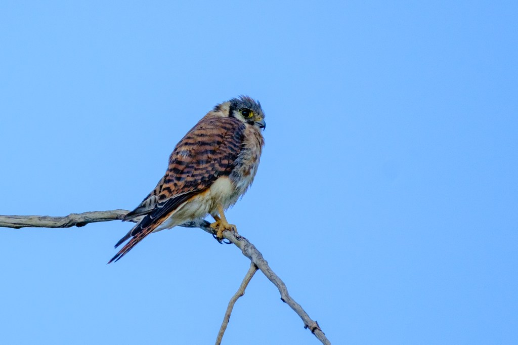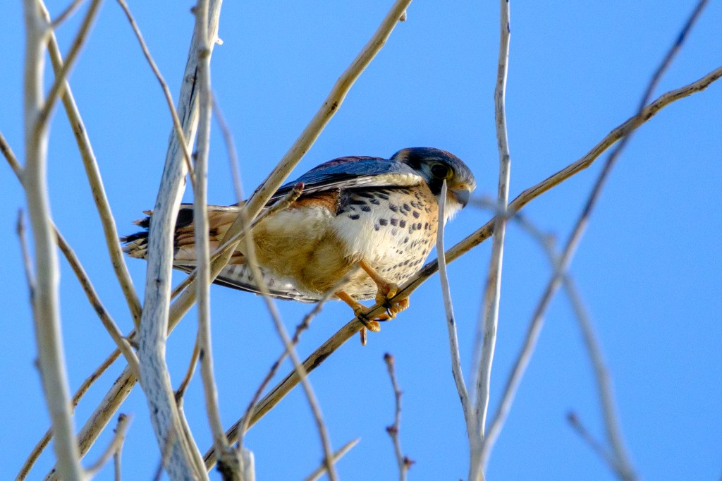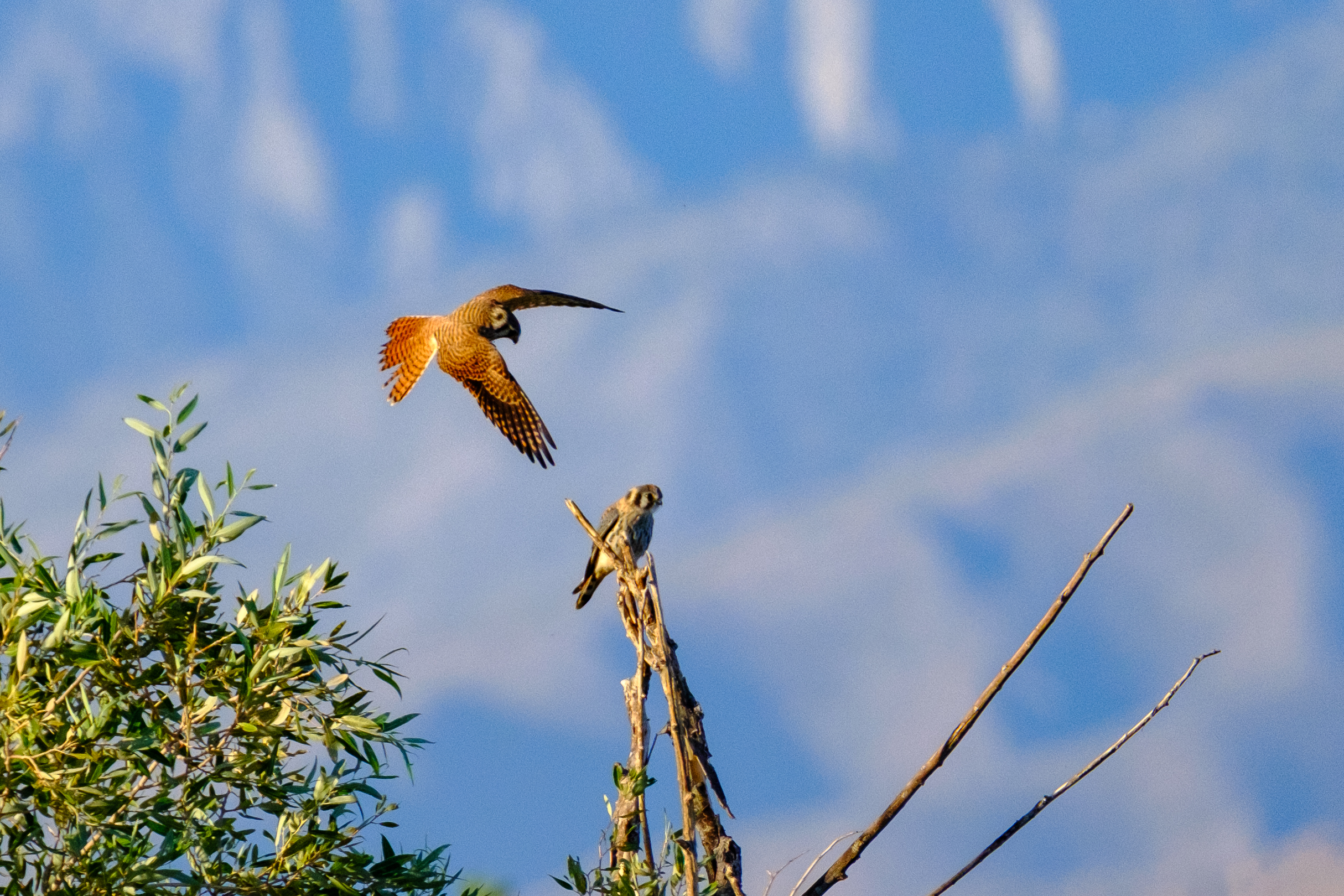 Kestrels are tiny falcons, just 9” long with a wingspan of 22”, weight 4 oz. When perched, they can be mistaken for a Dove, a Shrike, or even a Blackbird. I did not start to identify Kestrels until I bought a telephoto lens and started collecting pictures in 2020. Thanks to the camera, I now realize that the Bishop area is infested with American Kestrels. They hang out on trees near fields and sagebrush flats. They like to stand on naked branches, from which they hunt insects, lizards, mice, and small birds.