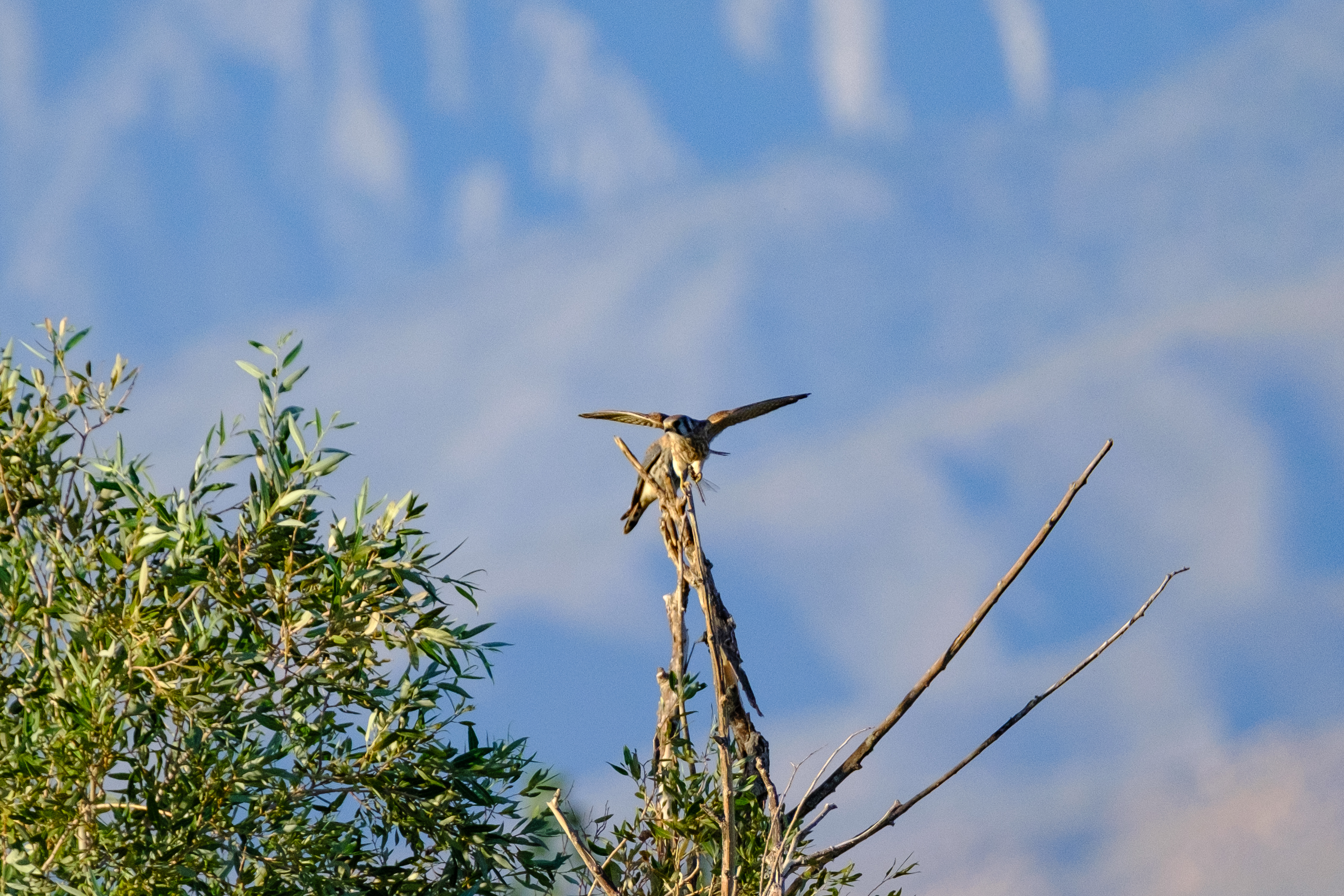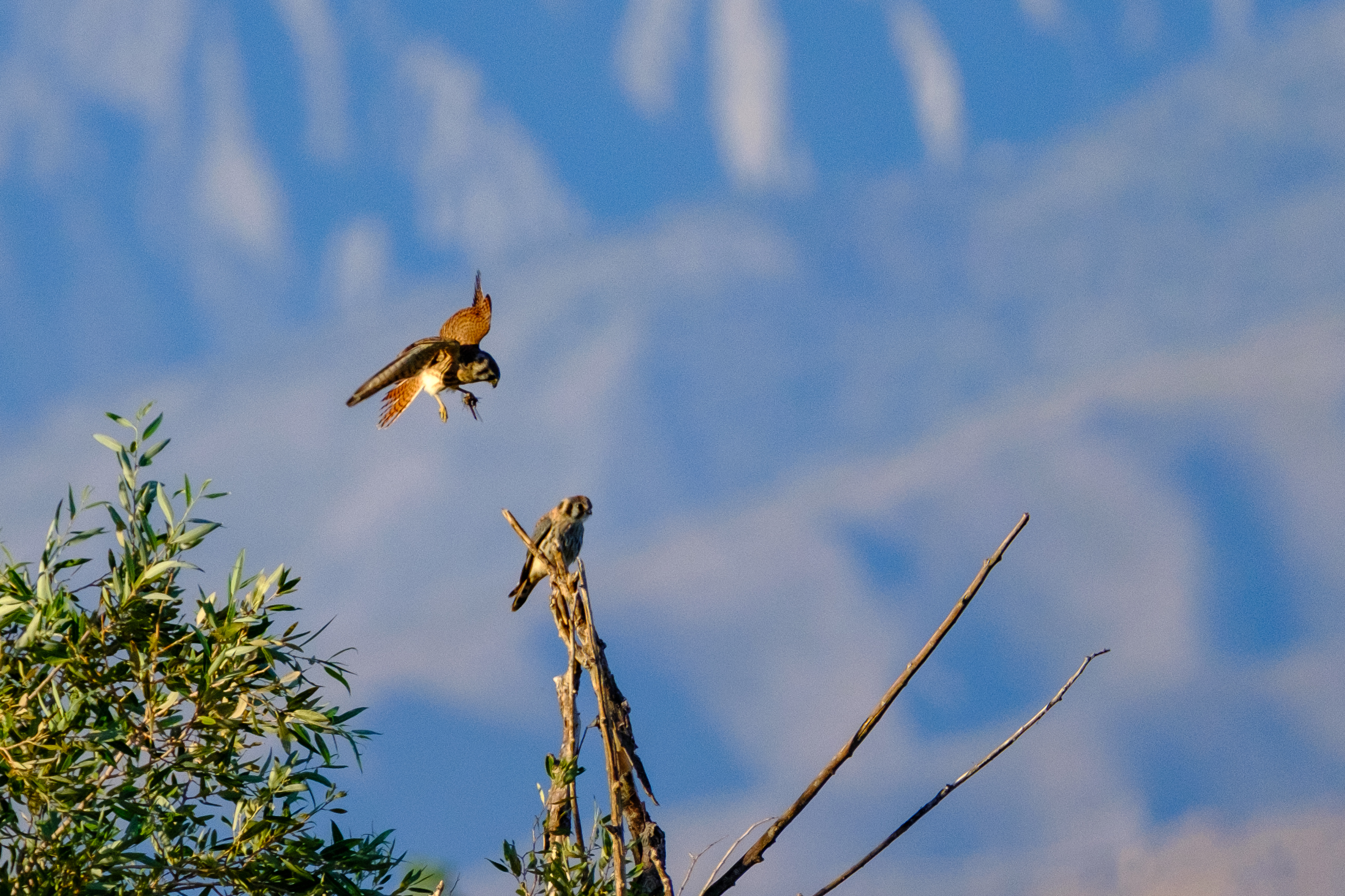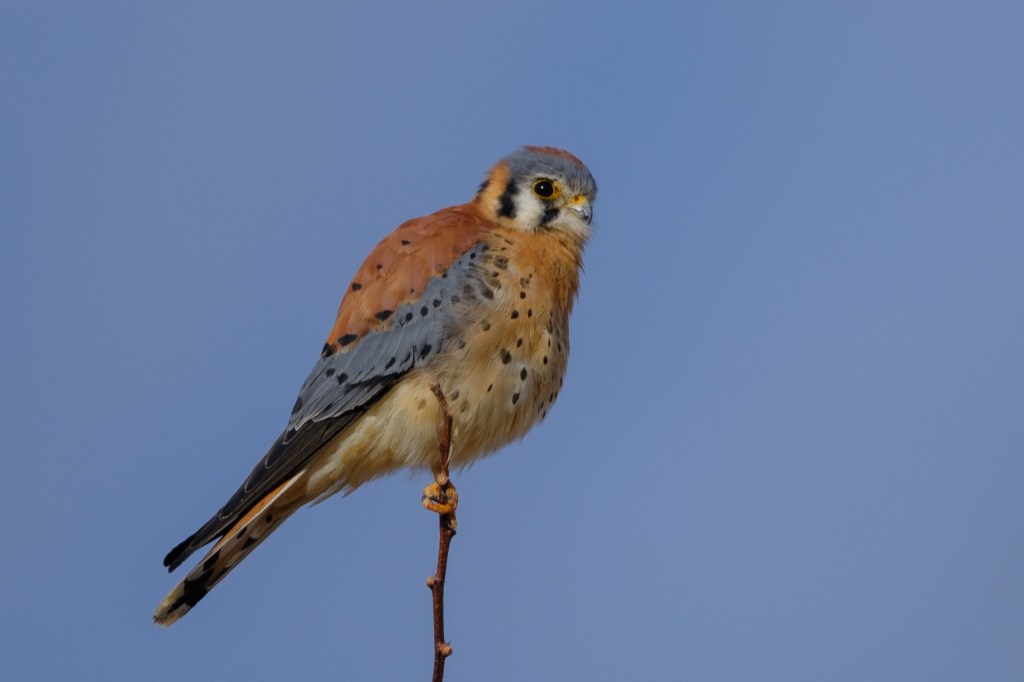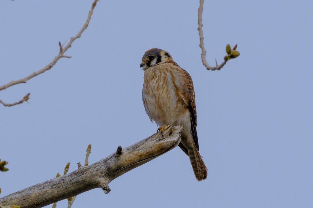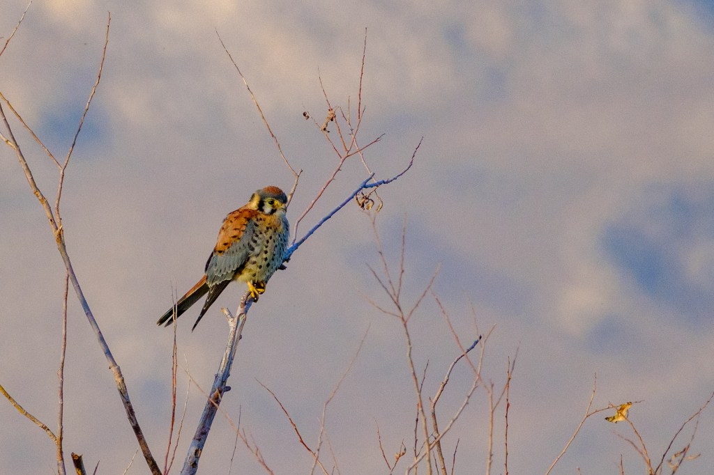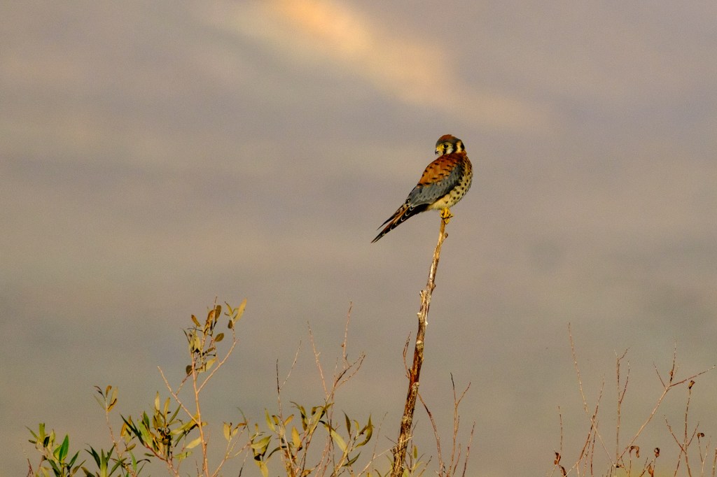 Kestrels are tiny falcons, just 9” long with a wingspan of 22”, weight 4 oz. When perched, they can be mistaken for a Dove, a Shrike, or even a Blackbird. I did not start to identify Kestrels until I bought a telephoto lens and started collecting pictures in 2020. Thanks to the camera, I now realize that the Bishop area is infested with American Kestrels. They hang out on trees near fields and sagebrush flats. They like to stand on naked branches, from which they hunt insects, lizards, mice, and small birds.