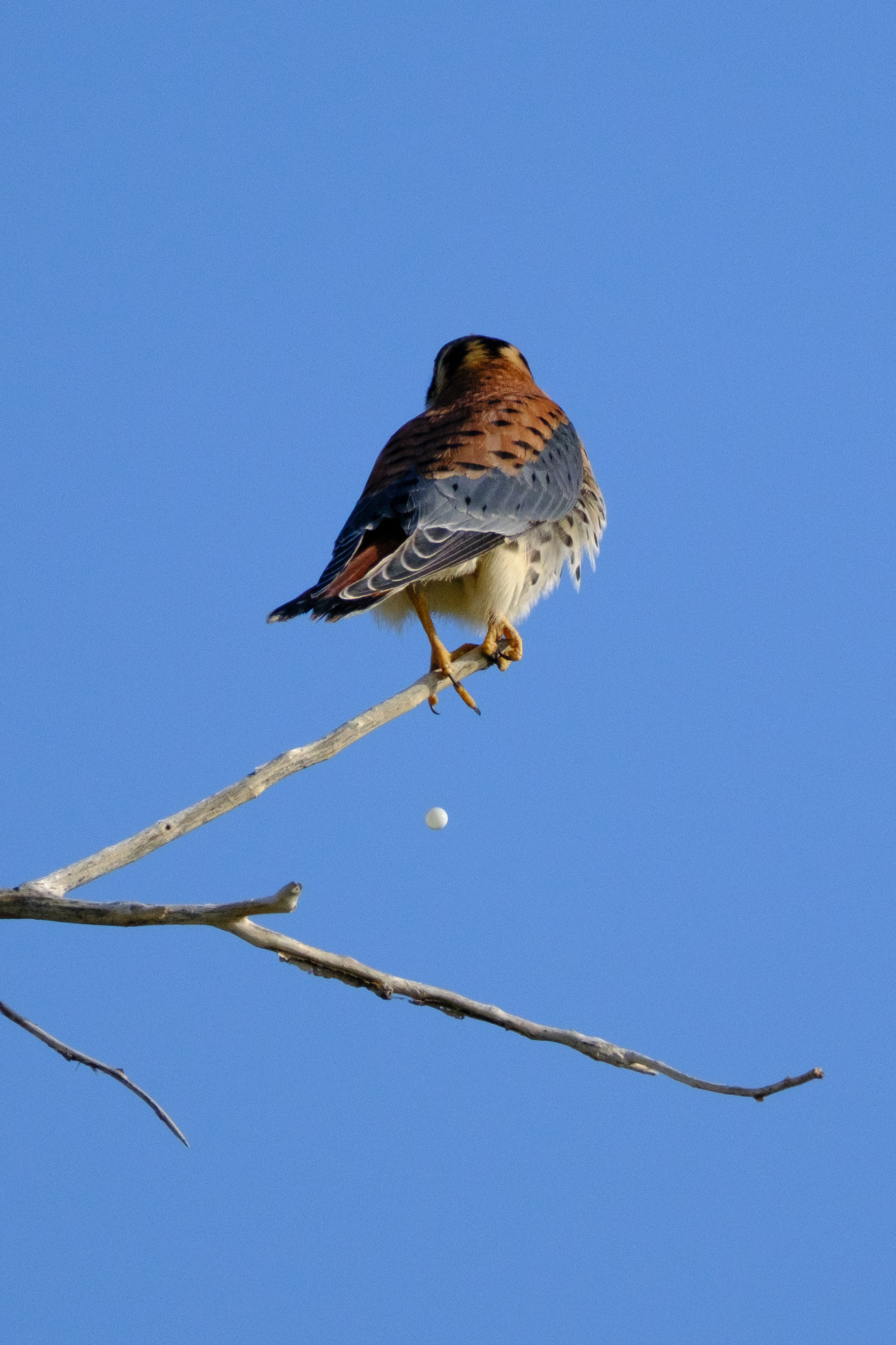 The third fact is related to defecation. If you are squeamish, you can skip this section. Kestrels do not build nests. They prefer to find cavities, such as holes left by woodpeckers. You have heard the phrase “Don’t soil your own nest.” Or, more crudely, “Don’t shit where you live.” Kestrels take this literally. Their waste, containing undigested food and a white paste of uric acid, is wrapped in a fecal sac, which is then evacuated. The bird can then throw this out of the cavity it resides in. Very tidy. Below, a photo sequence shows a bird evacuating and dropping this sac: