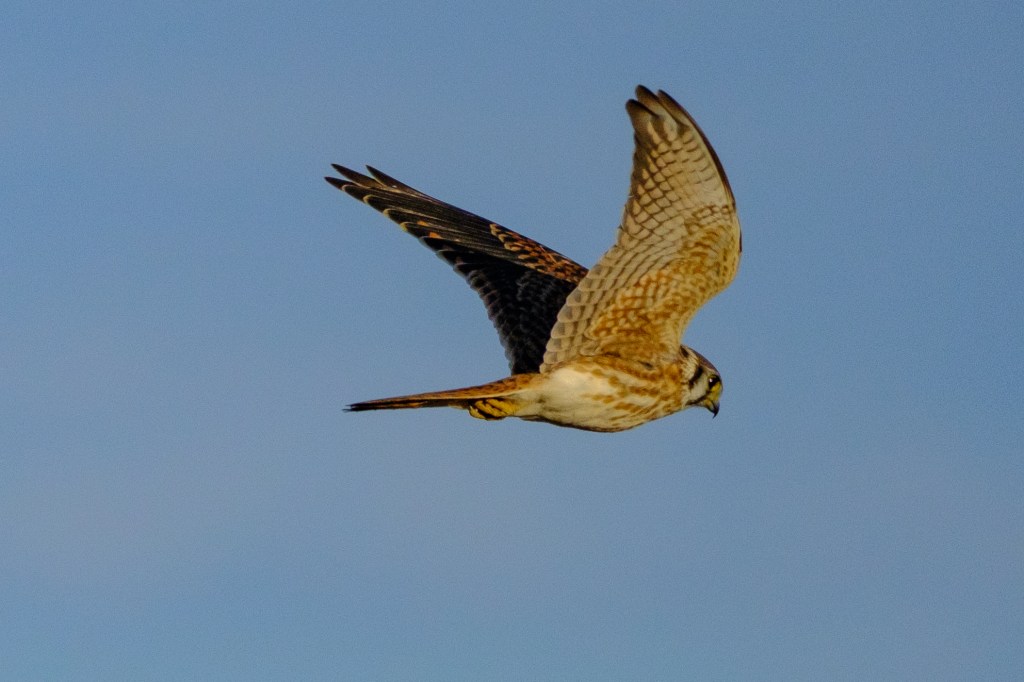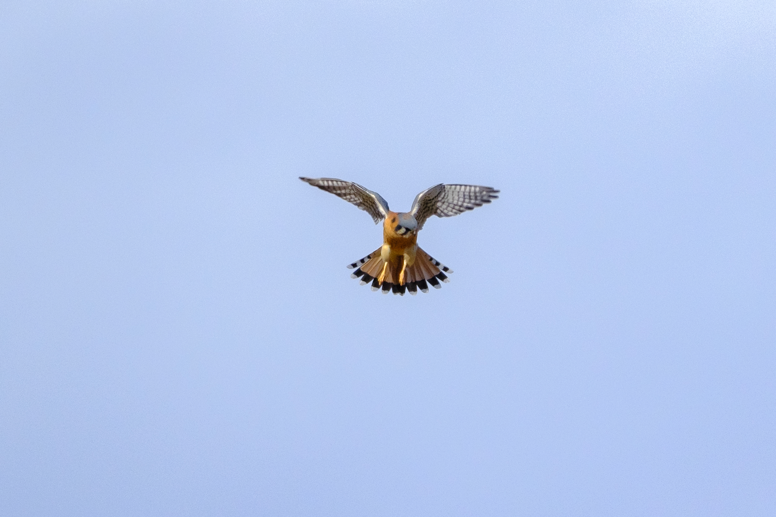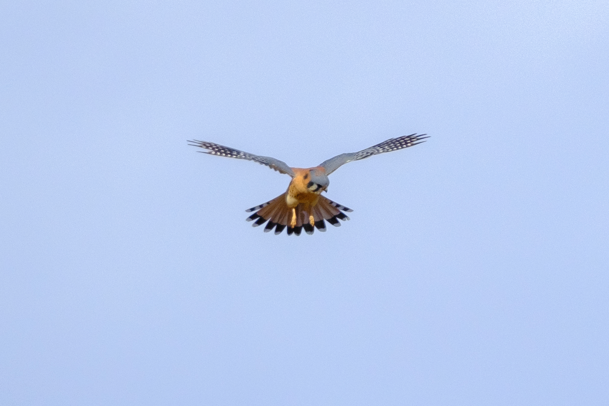 Sometimes Kestrels will hover. They will face into a breeze and maneuver their wings and tail to keep their head steady, while they search the ground below.