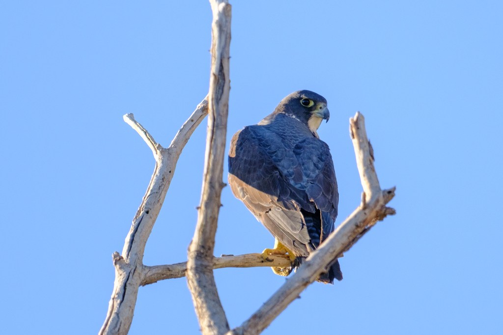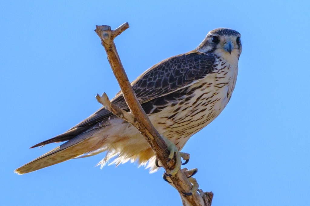 Three other falcon species can be found in the Bishop area. First is the Merlin, only a little bigger than a Kestrel: 10″ long, wingspan 24″, and 6.5 oz. They visit in fall and winter. Known for aggressive pursuit of other birds. Merlins come in 3 flavors: Pacific, Taiga, and Prairie. The photo below shows a bird with a faint mustache; probably a Taiga Merlin.