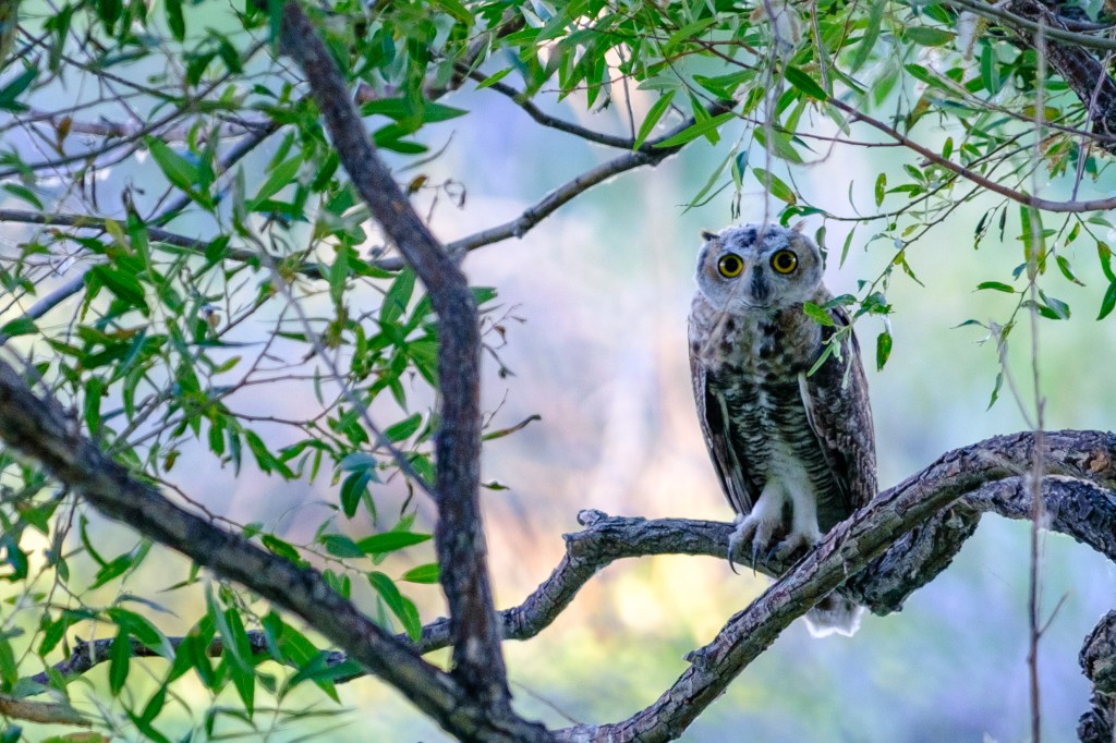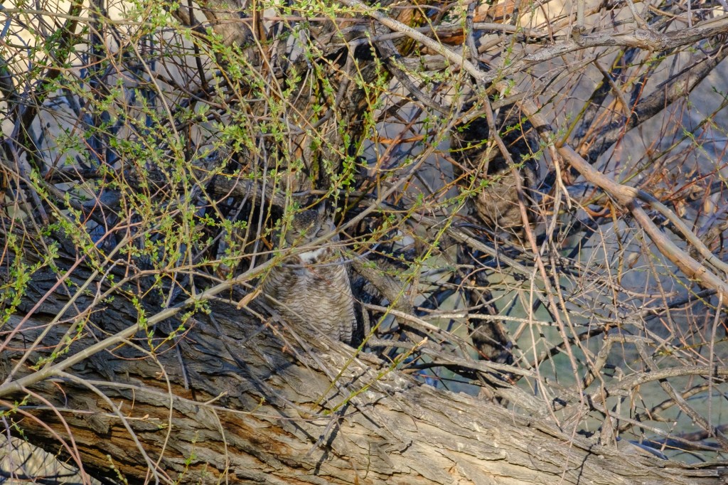 Below are photos of a typical owl, hiding in shadow behind branches. This is frustrating; it makes me want to carry hedge clippers so I can get a good photo. To find an owl, Roberta and I use camera or binoculars to study shaded areas. Often we spot an “owl” that turns out to be a stump or branch. One day we could not find an owl that we were sure was there; until we looked up and realized it was sitting on a branch just 4 feet above Roberta’s head.