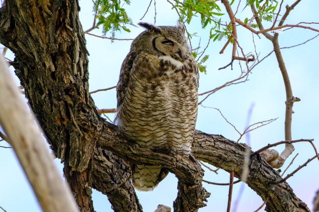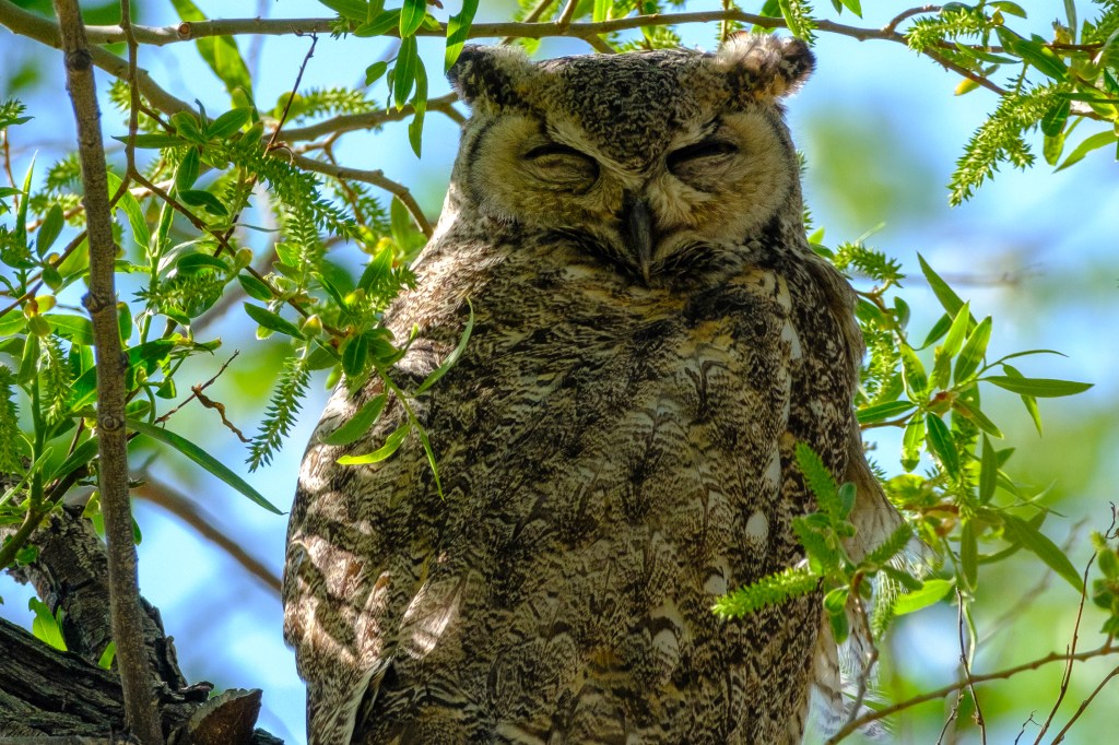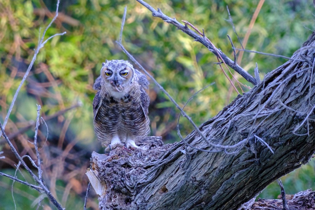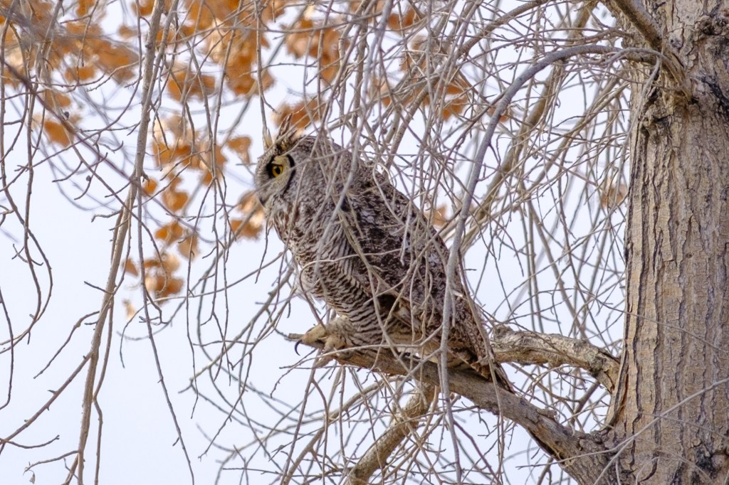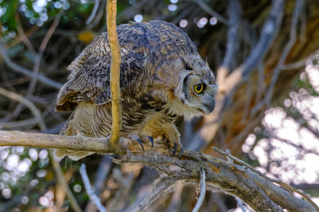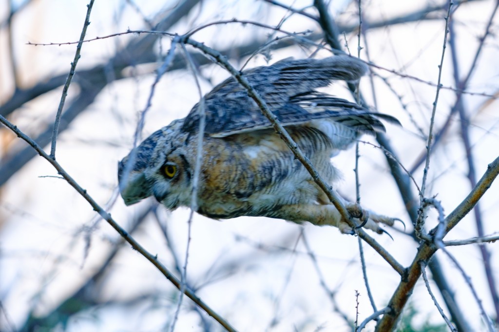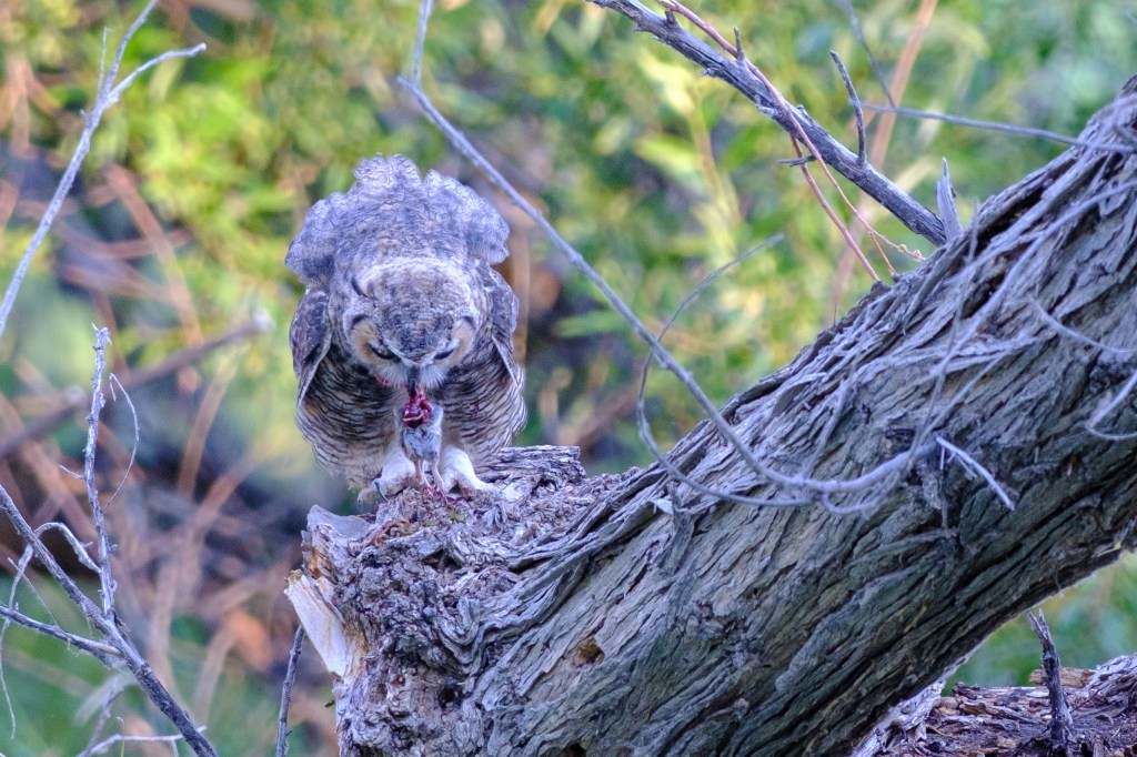 In their book about Sierra Nevada birds, Beedy and Pandolfino wrote: “Eagles may get all the press, but Great Horned Owls are really the top predator of the North American bird world. They feed primarily on rodents and rabbits but will kill almost any animal they can carry, including birds, snakes, fish, and even animals other predators avoid completely, like porcupines and skunks. They can fly away with prey as much as three times their own weight and are known to kill house cats, small dogs, geese, and Great Blue Herons on occasion.”