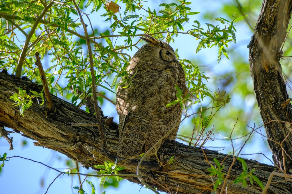 An adult Great Horned Owl is almost 2 feet long, has a wing-span of 3.5 feet, and weighs 3 pounds; a little bigger than a Red-tailed Hawk. In daytime, the owls sit on the ground or branches and blend in with surrounding trees. At night they use incredible hearing and eye-sight to hunt.