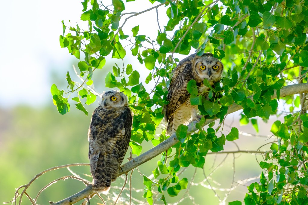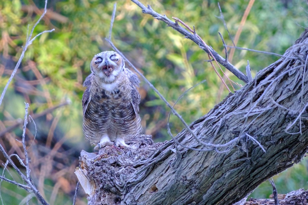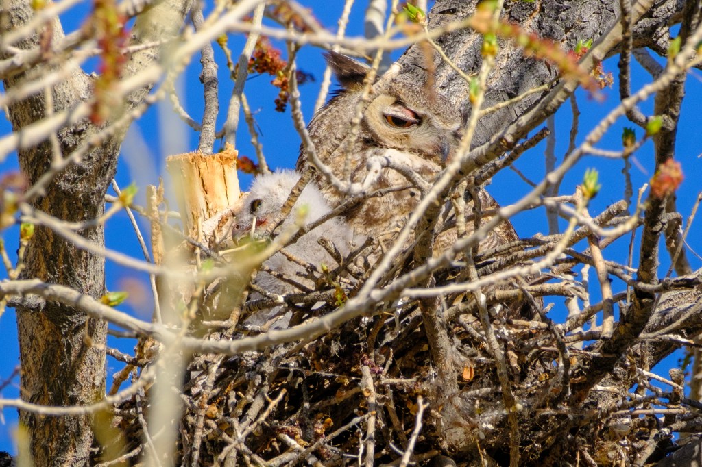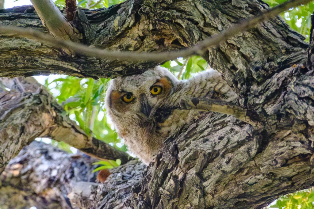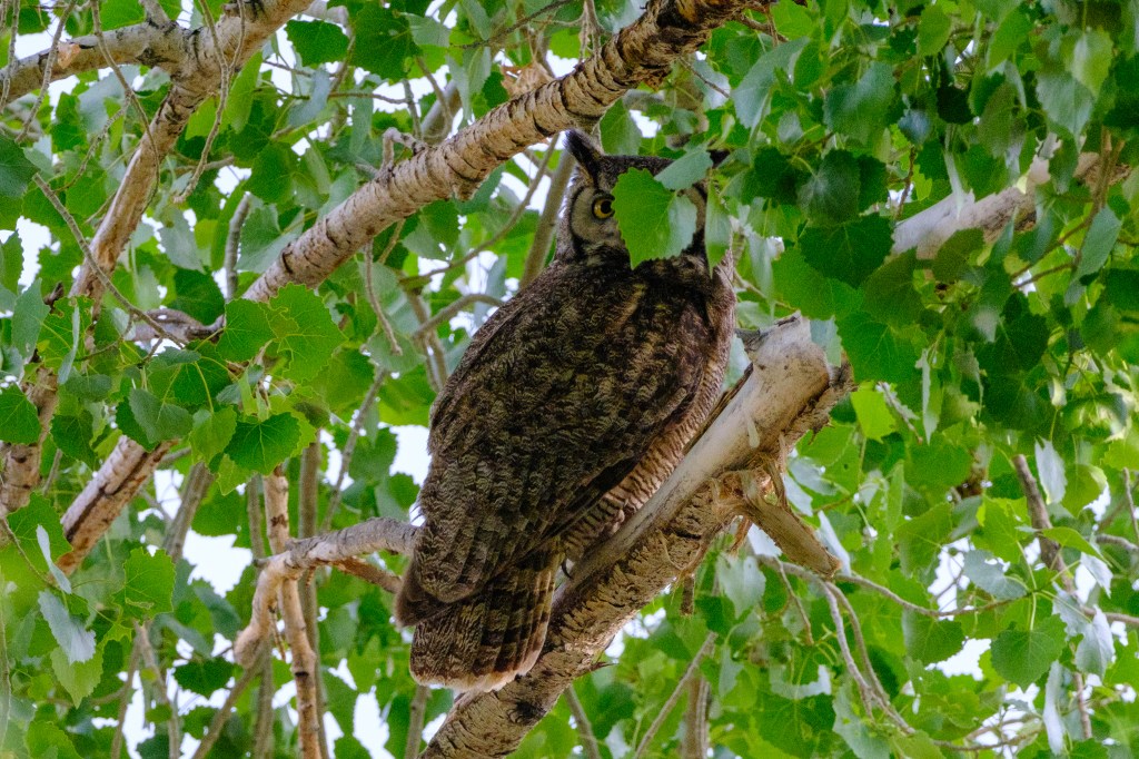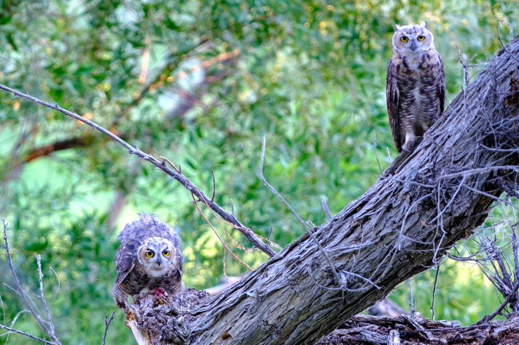 Roberta and I have seen Great Horned Owls near Bishop at the Bishop Creek Canal, Airport Road, and the Buckley Ponds. One reliable location is a dirt road that branches off Dixon Lane. The road is lined with cottonwoods and owls sometimes raise their young there. In January or February, a pair of owls will occupy a nest that was built by Red-tailed Hawks. Eggs arrive in March and babies appear in April. Two months later the fledglings are learning to fly. We have seen from 1 to 4 baby owls in the spring. Dozens of people walk this road every day, often with dogs, but the owls still like the location. This year there were 4 fledglings and I was able to collect some photos.