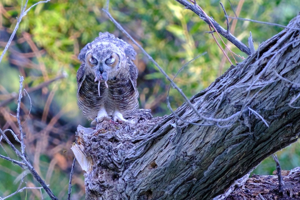 The next section is R rated for violence, blood, and atrocious table manners. When owls catch prey, they carry it back to their daytime hiding area, so they can eat in peace. They dismember the body, often decapitating the victim. Next they choke down large chunks. Photos below show a fledgling that cuts a mouse in half and swallows the headless body. You can see the feet and tail sticking out of owl’s mouth. The faint-of-heart should skip these photos.