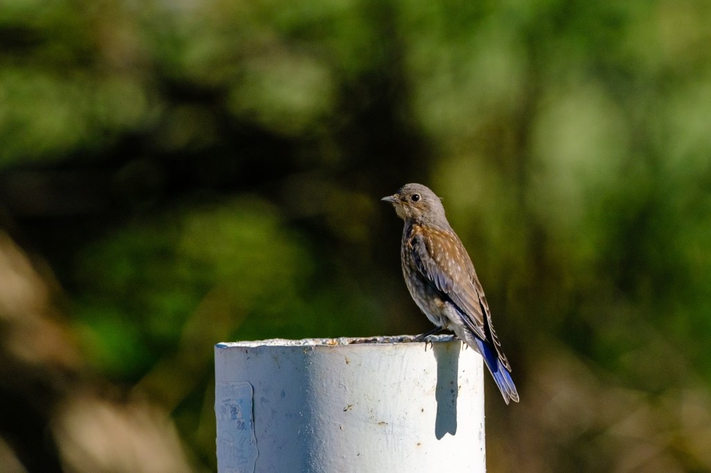 A juvenile Western Bluebird poses on a post.