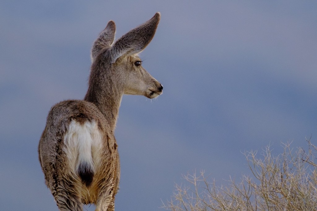 Mule deer are in our mountains and in the fields and desert near Bishop. This one is partly wet because she just crossed the Rawson Canal. They are named for their ears.