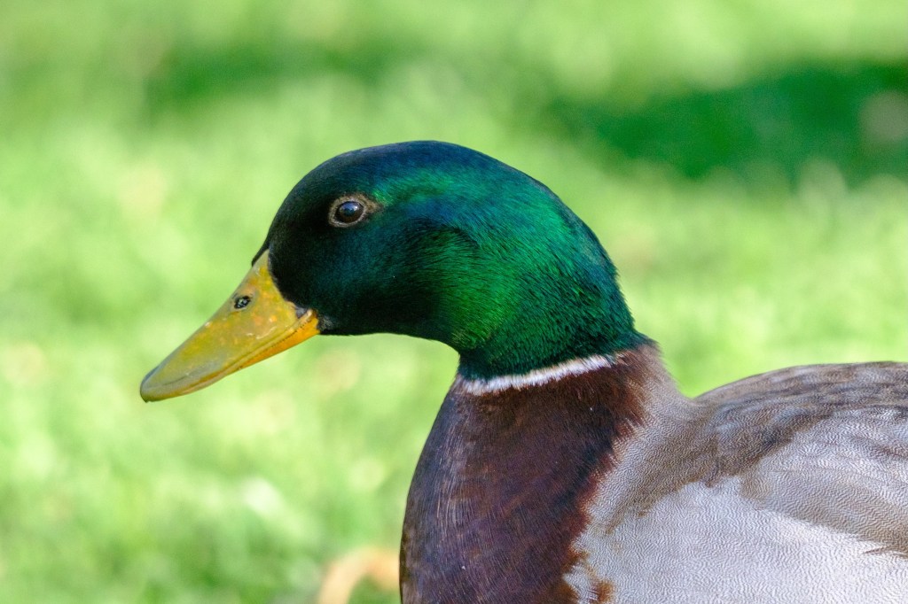 Mallards are usually found at Bishop City Park. They sleep in my backyard and they float on our local ponds and canals. During breeding season the males have bright green heads, but the light angle can make the head look purple, blue, or black. For years, I thought there were two species of Mallards until I saw a duck that seemed to change its color right in front of me. The male below has a head that seems to be half black and half green.