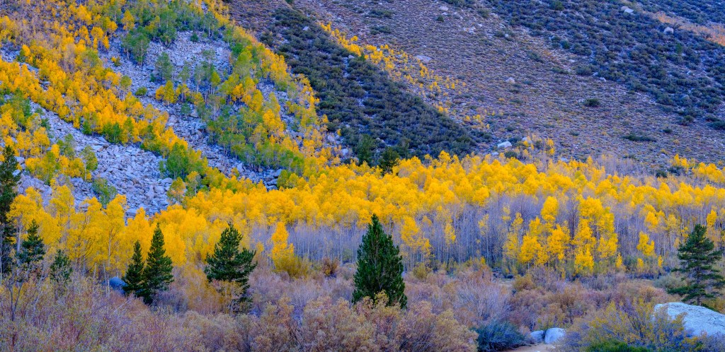 In October, the aspens change colors. This panorama shot was taken up the canyon from the Bishop Creek Lodge.