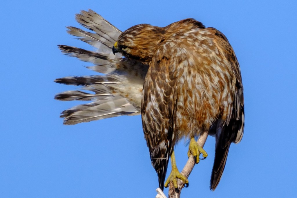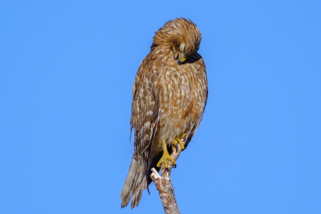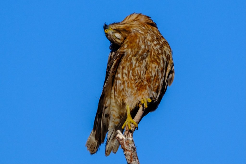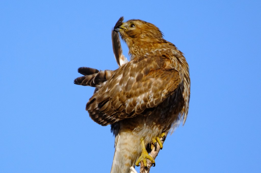 Birds spend a lot of time preening — taking care of their feathers. This Red-shouldered Hawk was tearing out feathers, licking them, and generally going nuts at the Buckley Ponds.