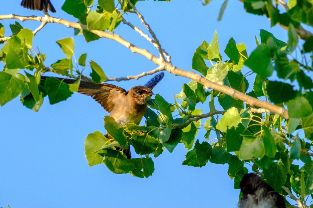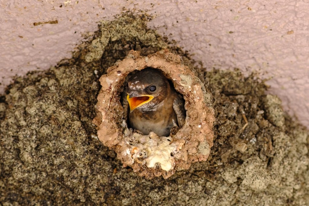 Cliff Swallows build their mud nests on the side of the Mono Basin Visitor’s Center in Lee Vining. The fledglings want food in early July.