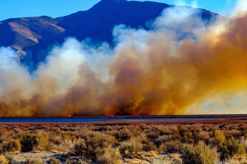 In February, the Airport Fire started near Bishop’s airport. It jumped to the cottonwoods along the Owens River. High winds pushed the flames south along the stream for over 15 miles, threatening Big Pine. I took photos looking across Klondike Lake.