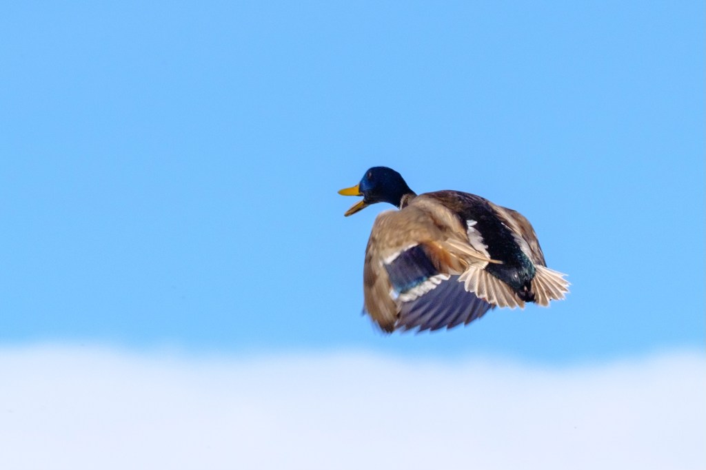 Mallards take off with explosive force; their wings boost them up by pushing down on the water. At Airport Road, Roberta and I have been startled when 100 ducks take off at once. The picture below shows a quacking Mallard that just took off from the Buckley Ponds.
