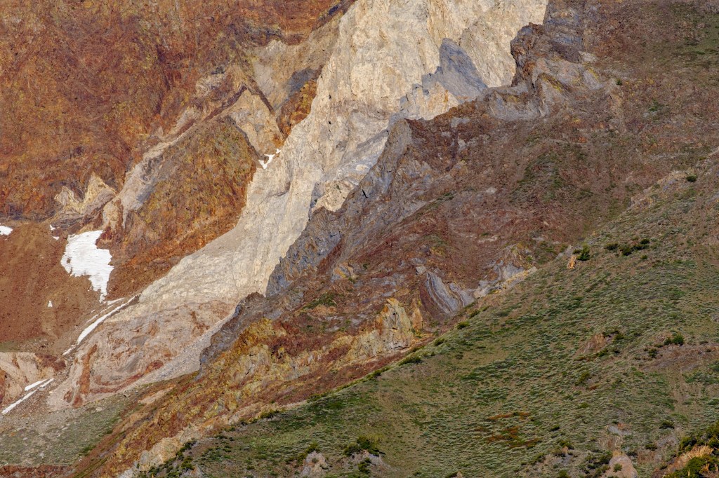McGee Creek (and nearby Convict Creek) both have colorful twisted layers of sedimentary rock. The telephoto shot below shows ridges of different rock types that cover the north wall of the canyon.
