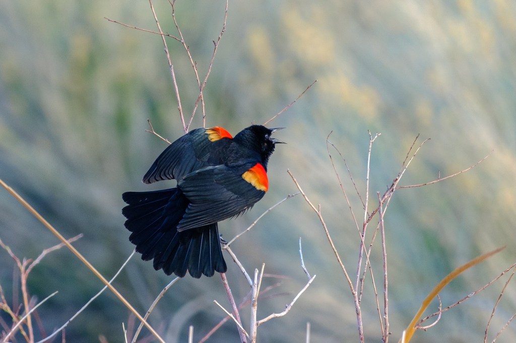 Red-winged Blackbirds show up in late February and sing incessantly for months.