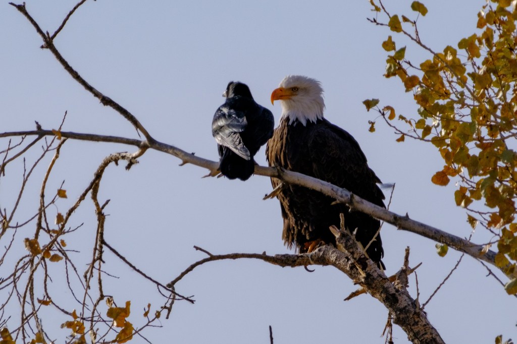 It looks as if this Bald Eagle is chatting with a Raven. I suspect the Raven is harassing the eagle.