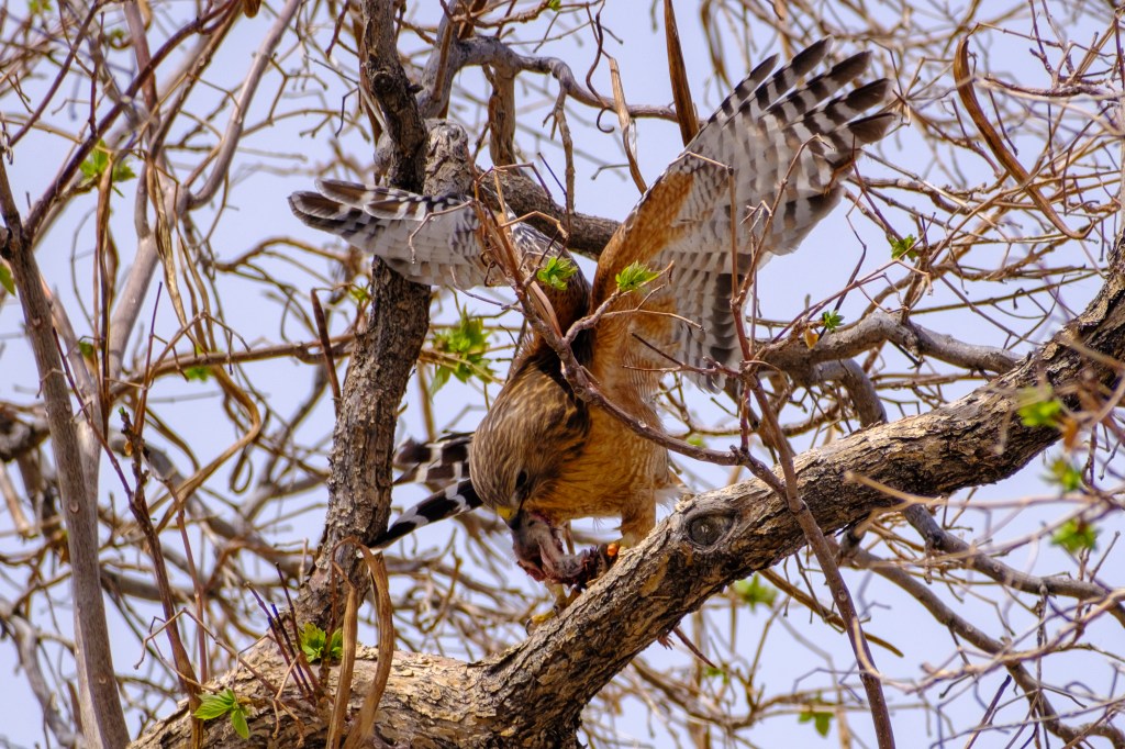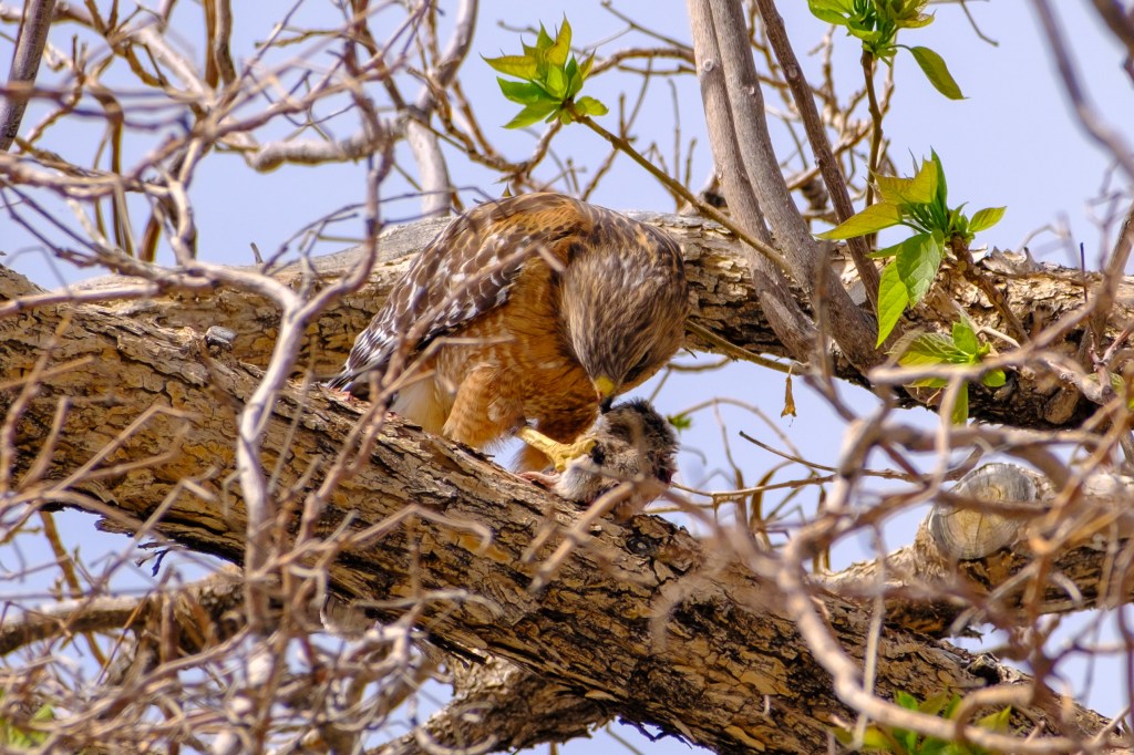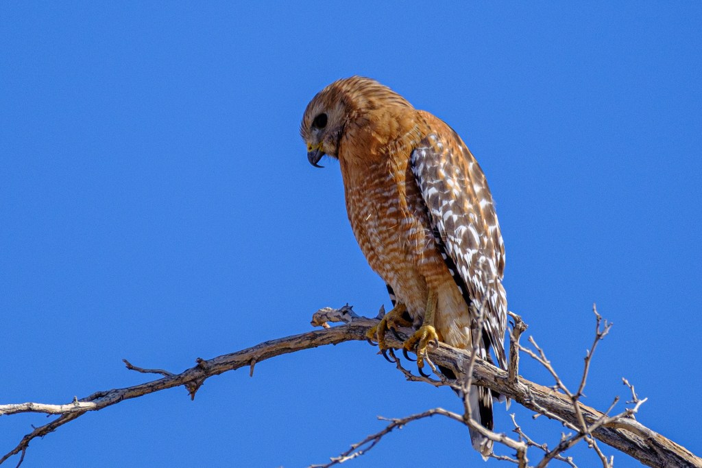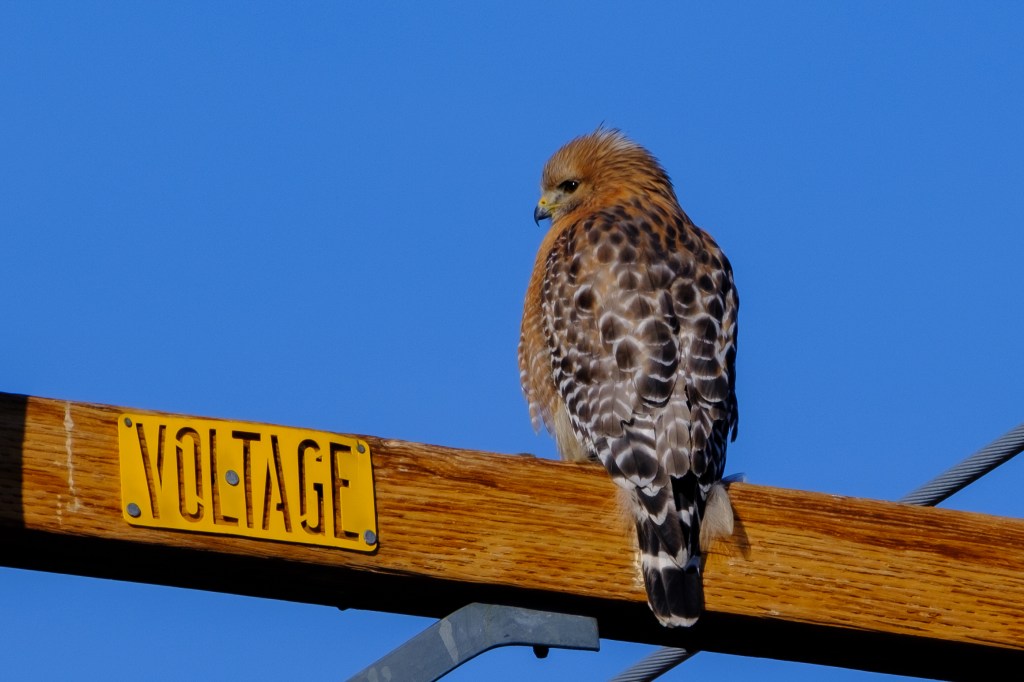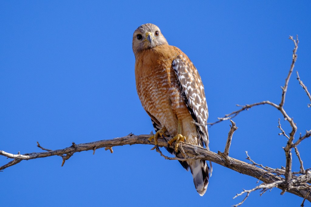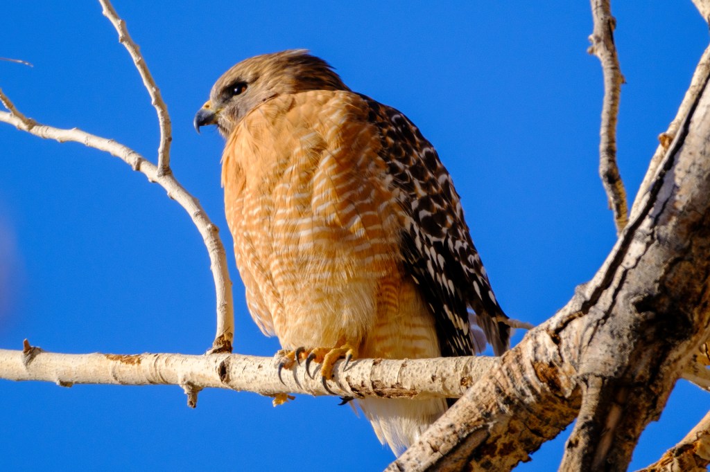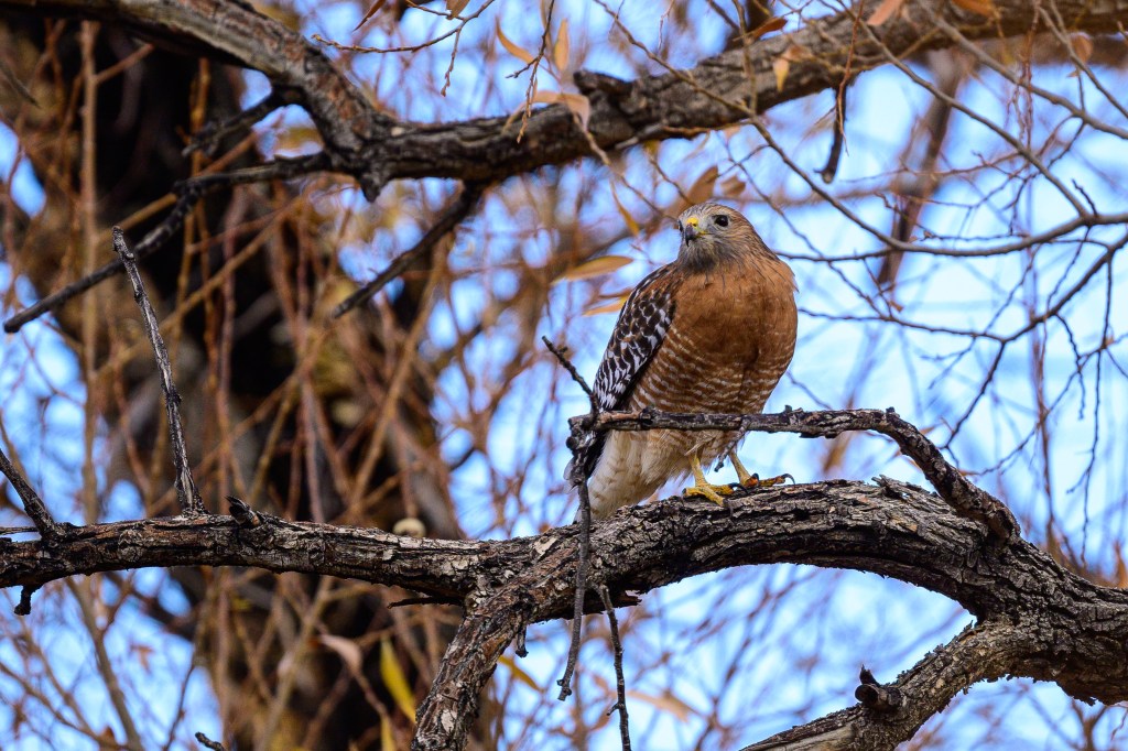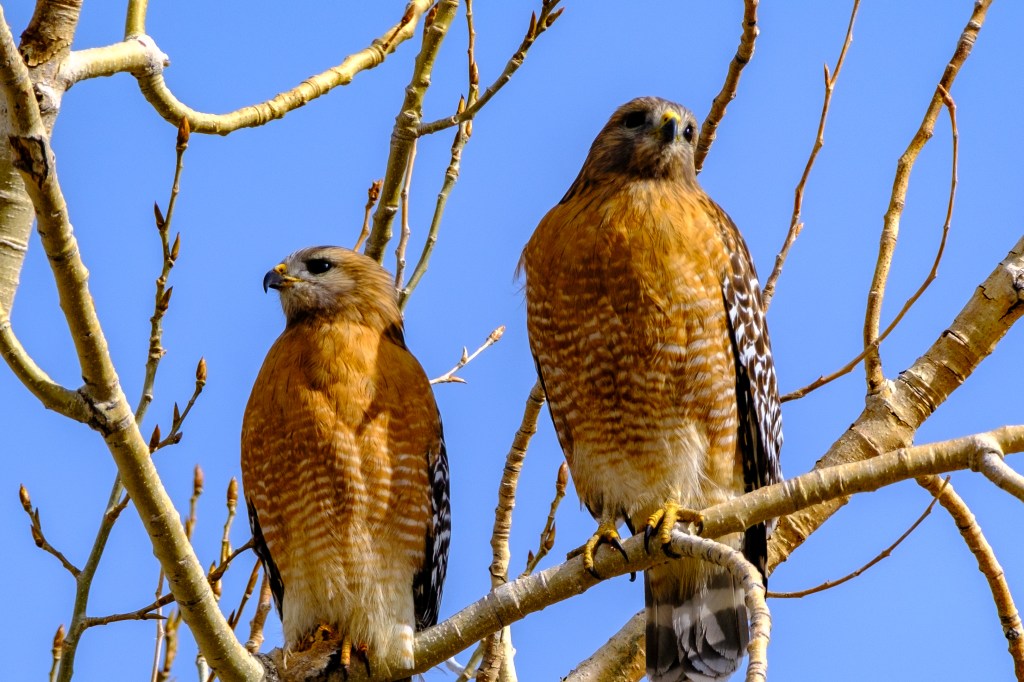 Red-shouldered Hawks are a medium-sized raptor. Smaller than a Red-tail, larger than a Cooper’s. Here is a table of size and weight (numbers from Sibley’s guide) for some local raptors: