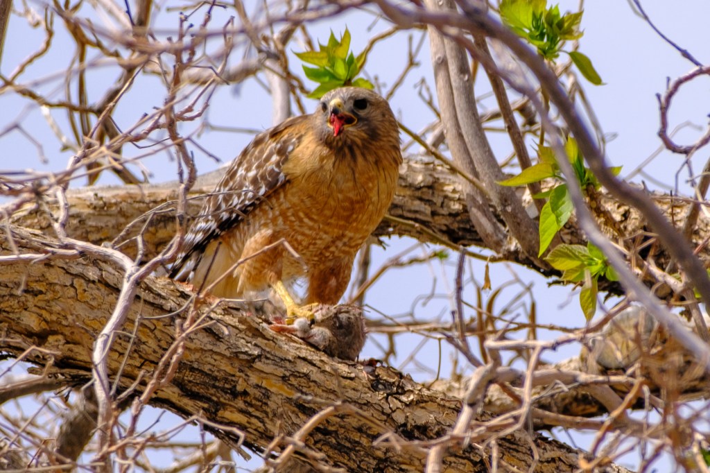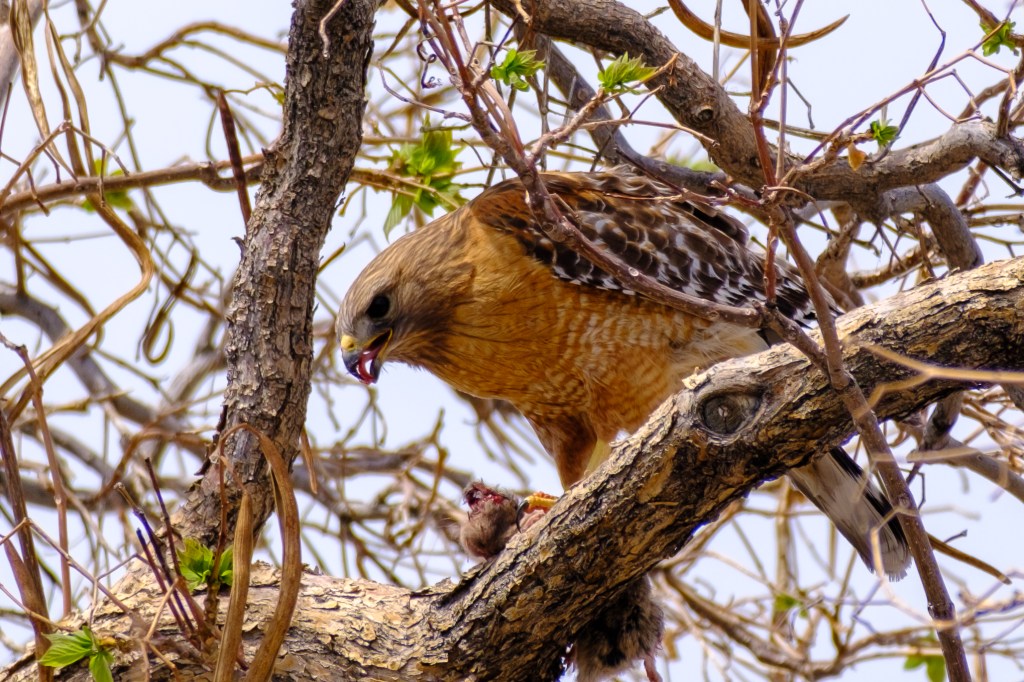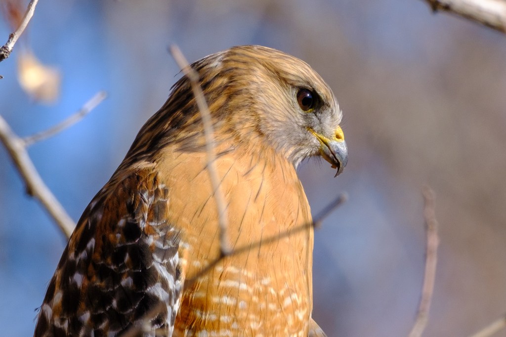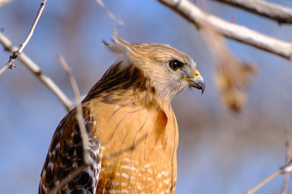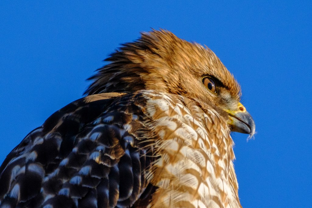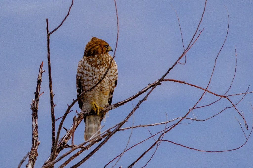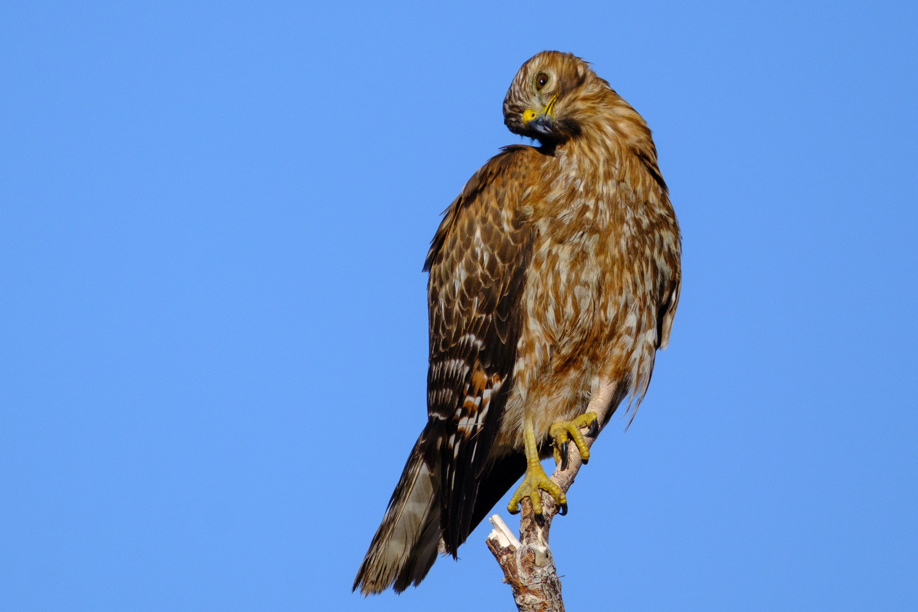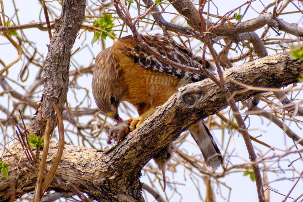 Red-shouldered Hawks are a medium-sized raptor. Smaller than a Red-tail, larger than a Cooper’s. Here is a table of size and weight (numbers from Sibley’s guide) for some local raptors: