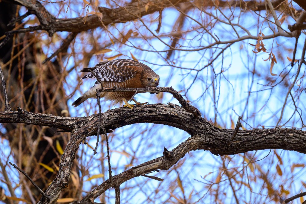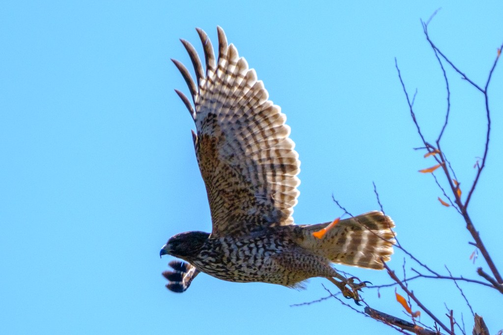 A Red-shouldered Hawk takes off on the Bishop Creek Canal. Left wing shows the band of light color.