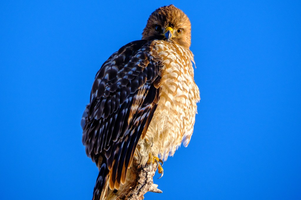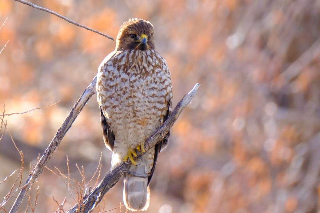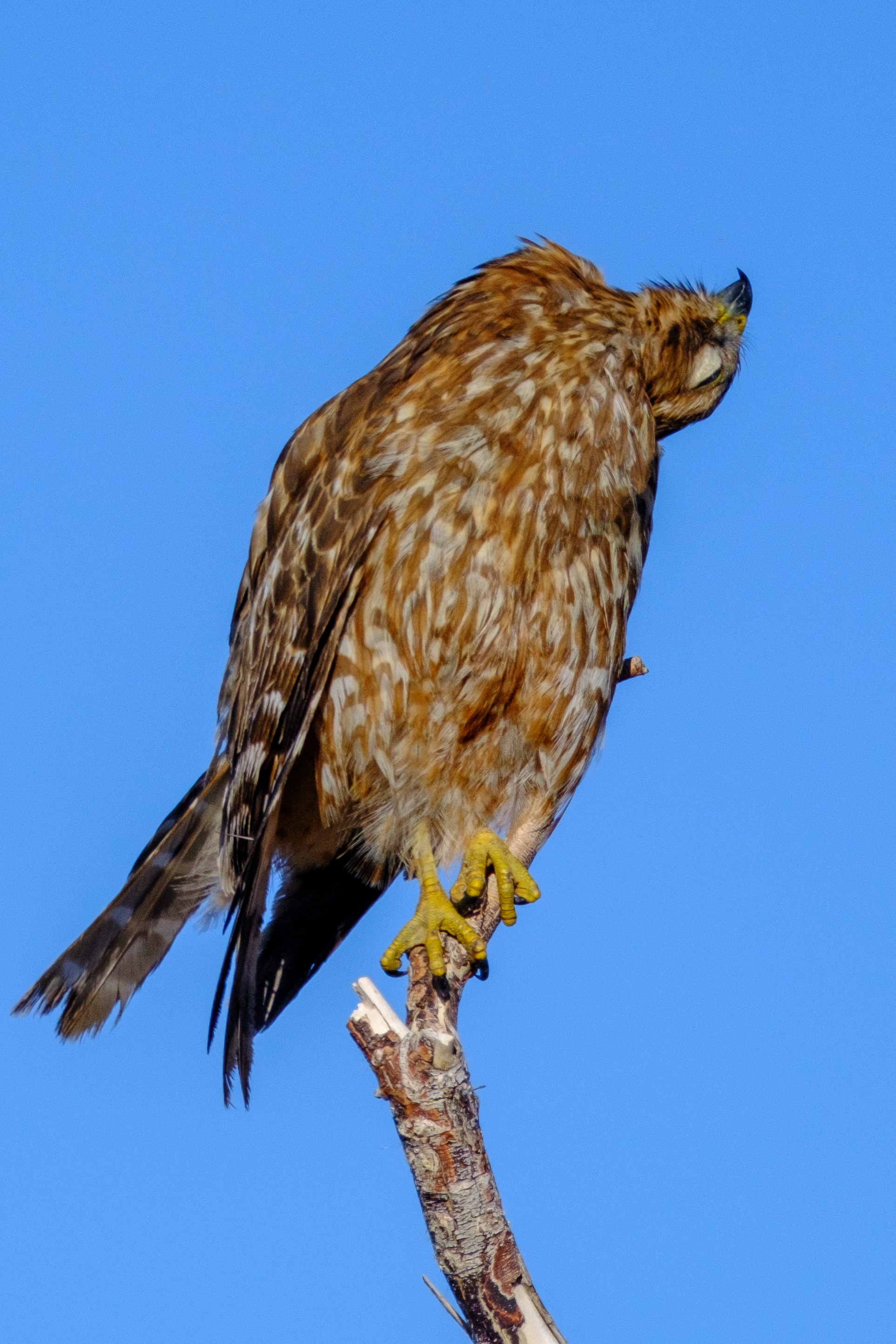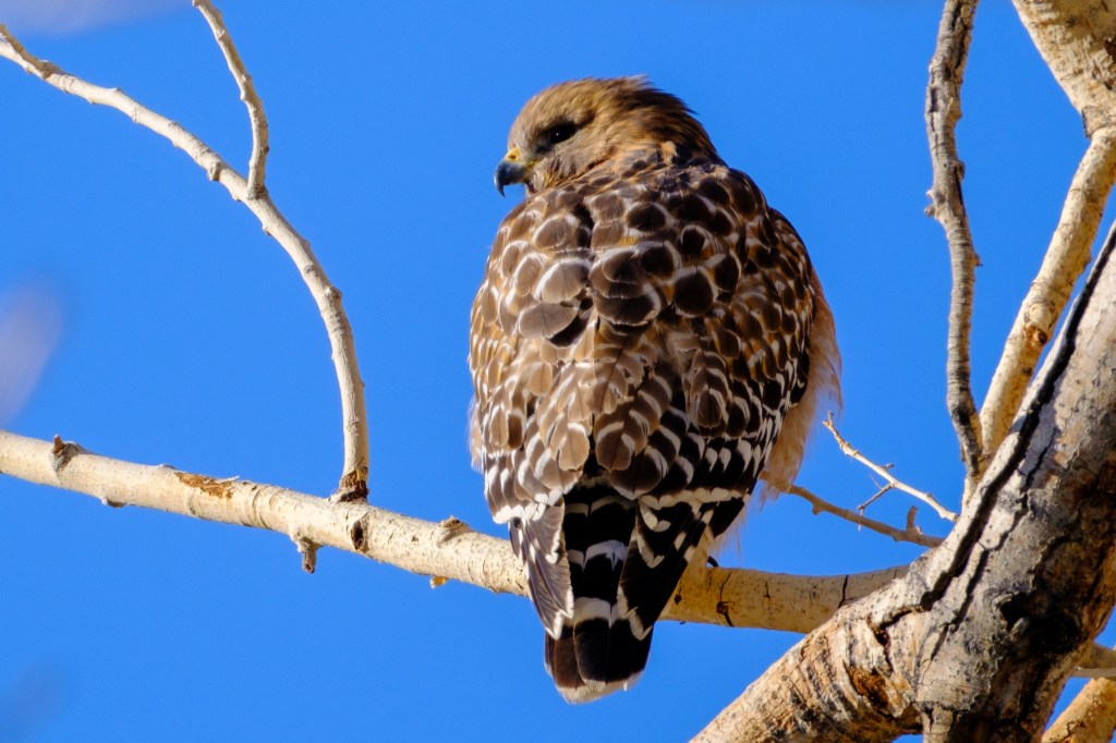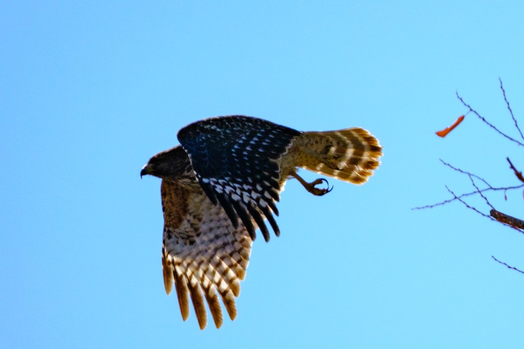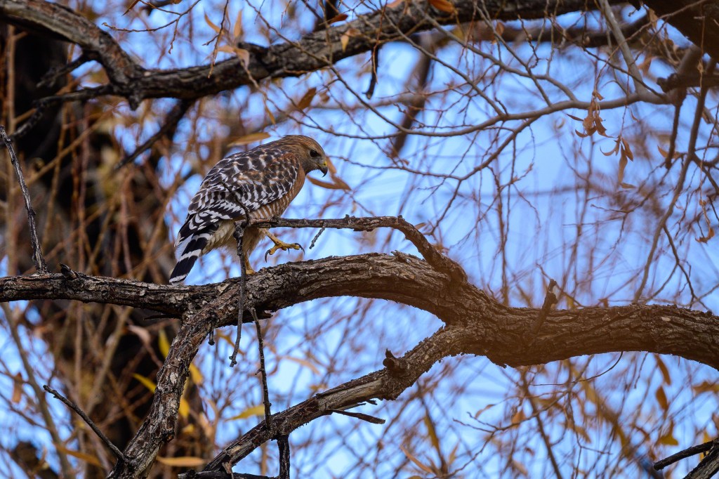 A few days later I returned to the COSA and again saw a Red-shouldered Hawk. Same one? First I show a frontal view. Then a view of the back. The tip of the tail is white, most of the tail is black with thin white bands. The primary feather tips lie on top of the tail, but fail to reach the tail-tip. A curtain of white feathers lies on top of the primaries. From the back, the red-shoulders and breast are often invisible, but the feather pattern I’ve just described helps identify this bird.