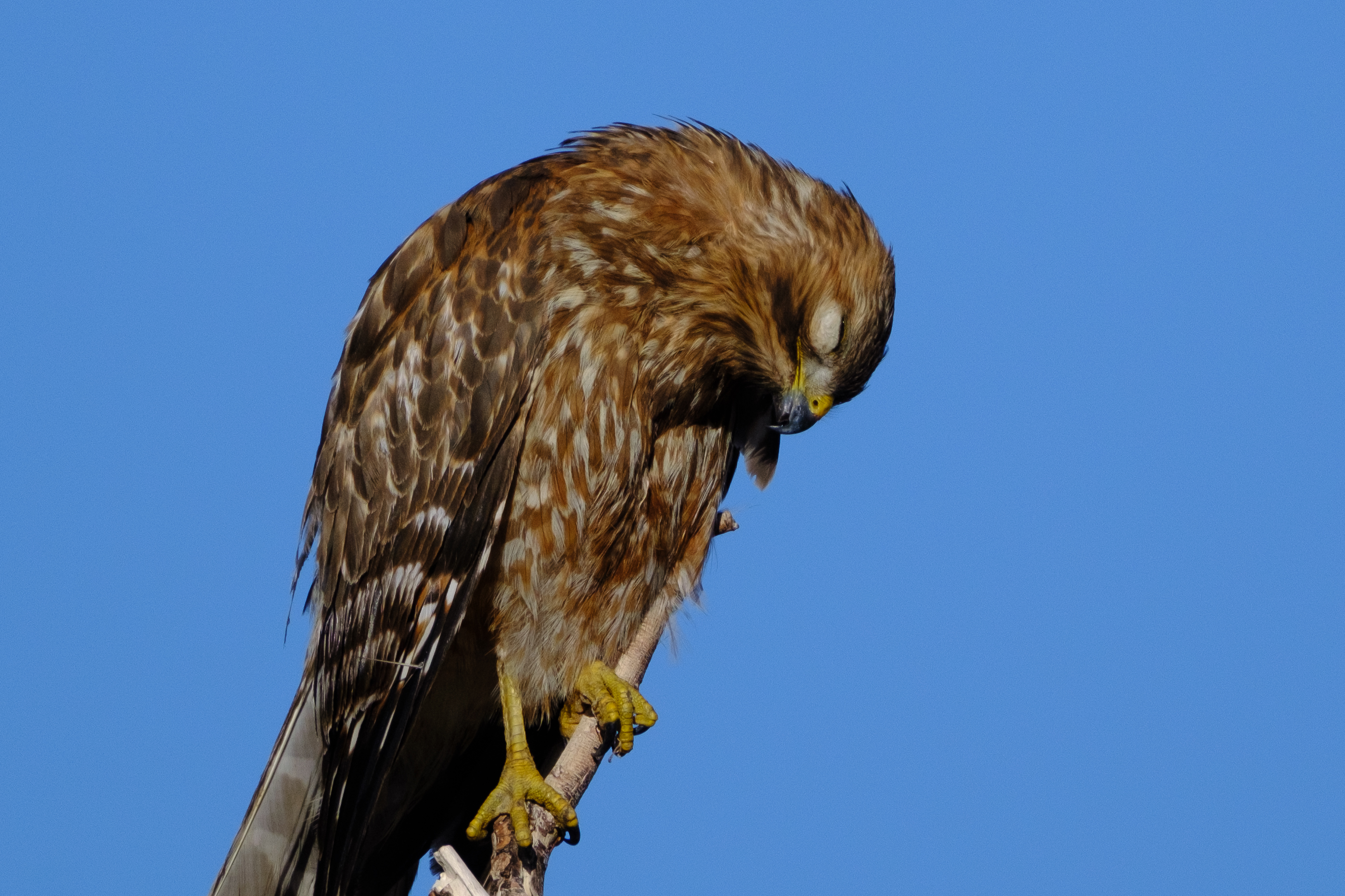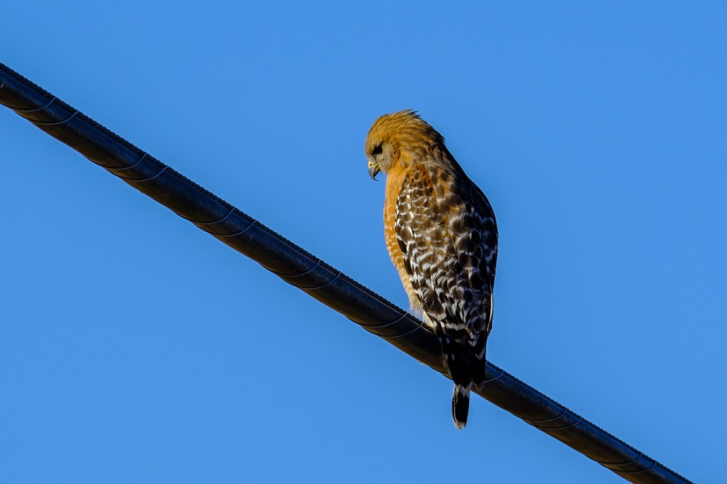Red-shouldered Hawks are “still-hunters” or “perch-hunters.” They sit on a branch or wire and look down, patiently watching for prey. While they do this, they look hunched over; see photo below. When they spot a rodent or insect, they will swoop down and grab it. Instead of flying down, they may just topple forward (or backward) and drop, falling quickly with little movement. Their folded wings snap open just before they hit the ground. I’ve seen this twice; it looks as if the bird just fainted and fell off the wire. See the hunting posture below.