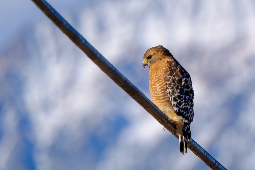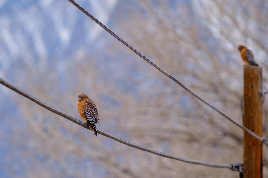 They were absent from Inyo County until 1968, when the dead body of a Red-shouldered Hawk was found in Death Valley. During the 1970s, they moved into the Bishop area. Now they live here year-round, nesting and raising their young. They are on tree branches and power lines all over Bishop and the surrounding fields. They control the land along West Line Street from downtown to Riata Road. One of these hawks hunts patiently from a Line Street telephone cable; I drive past this bird 50 times a year.