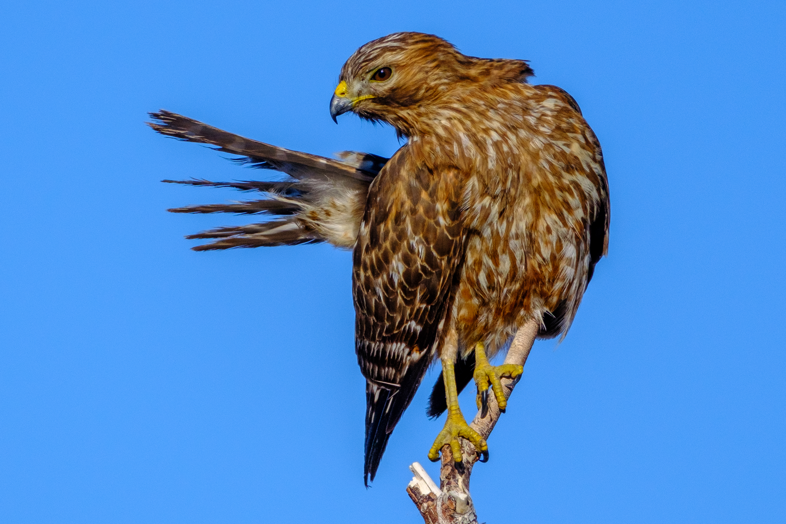 The picture below shows a RSHA landing on a post near the Bishop Creek Canal. At the end of each wing are long, dark, primary feathers. At the base of the primary feathers is a band of white; this is sometimes described as a translucent window, crescent, or comma. This feature can help identify the bird in flight. This translucent band can be seen below.