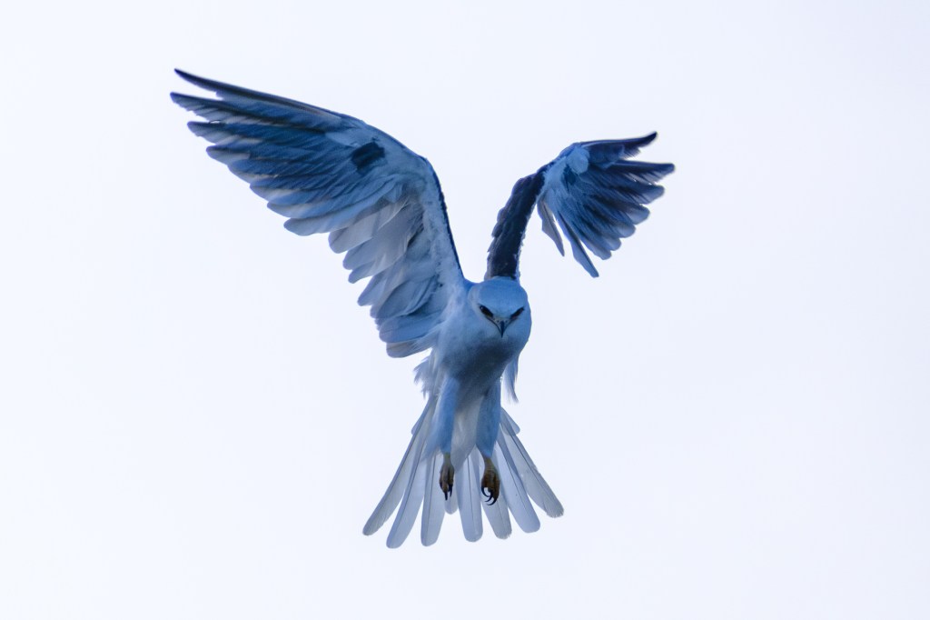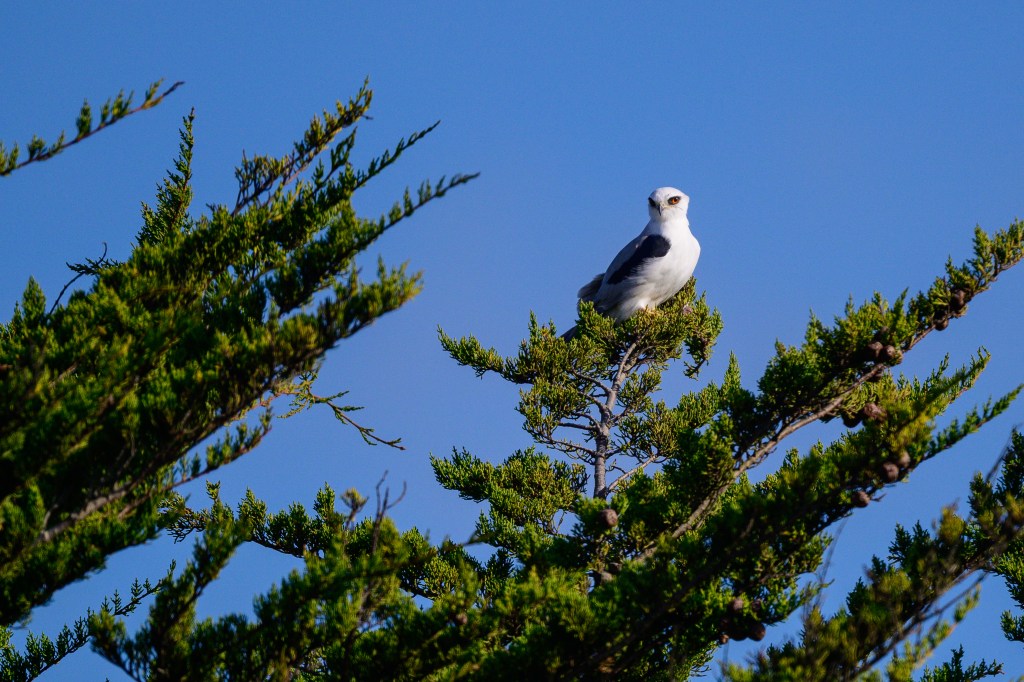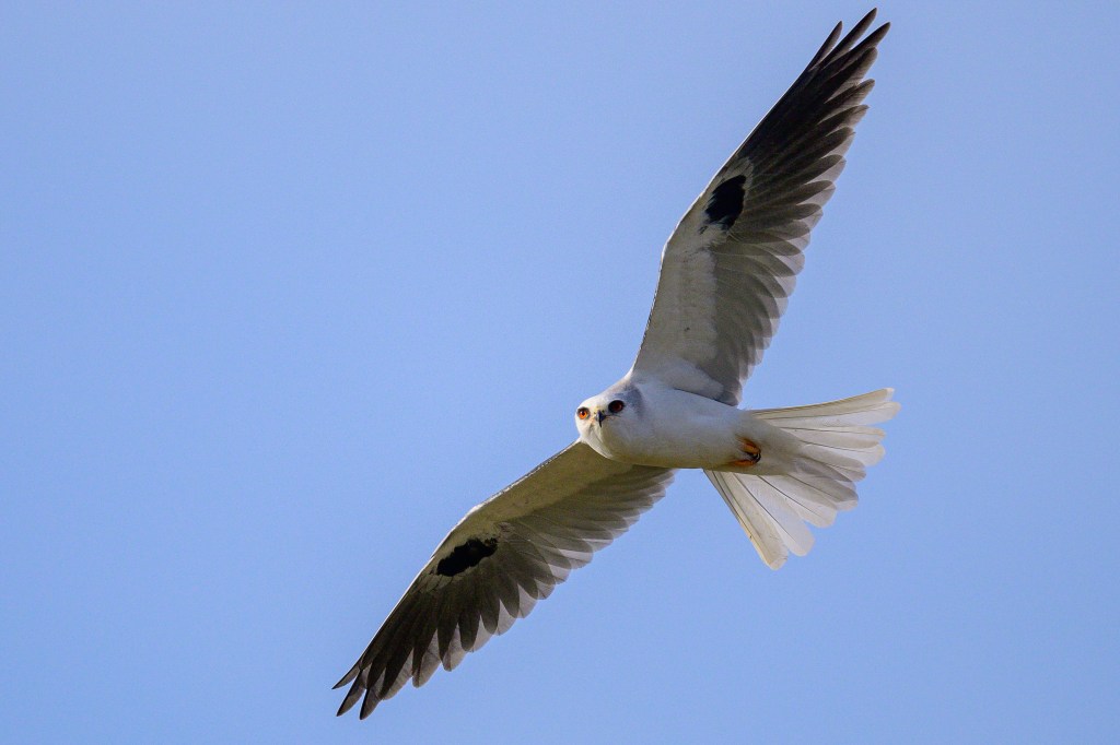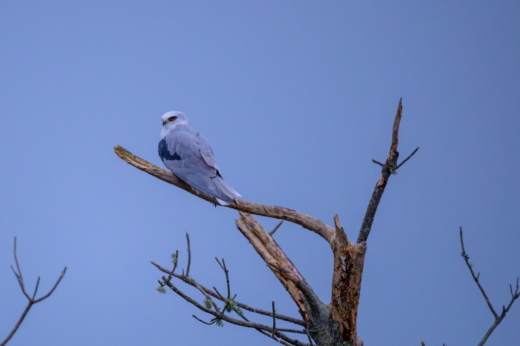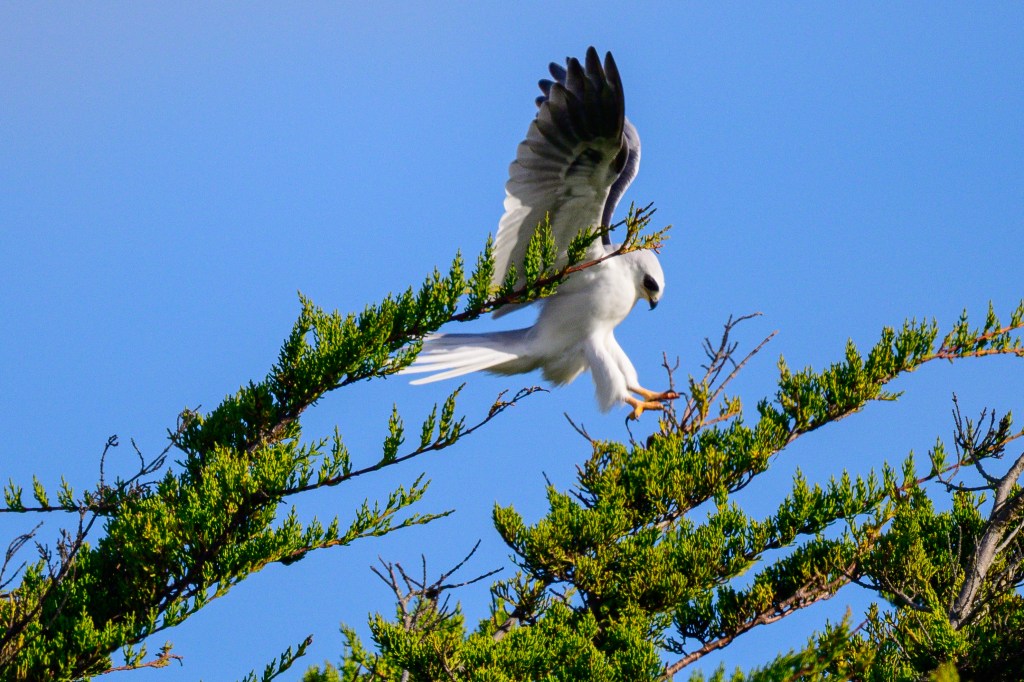White-tailed Kites live on the West Coast, in the Southwest, and along the Gulf of Mexico. They rarely visit the Owens Valley; I have never seen one near Bishop. They hunt by hovering, ready to drop and grab small rodents. The white wings look angelic, but the red eyes look devilish. For the last 3 years I’ve seen these birds at the coast.