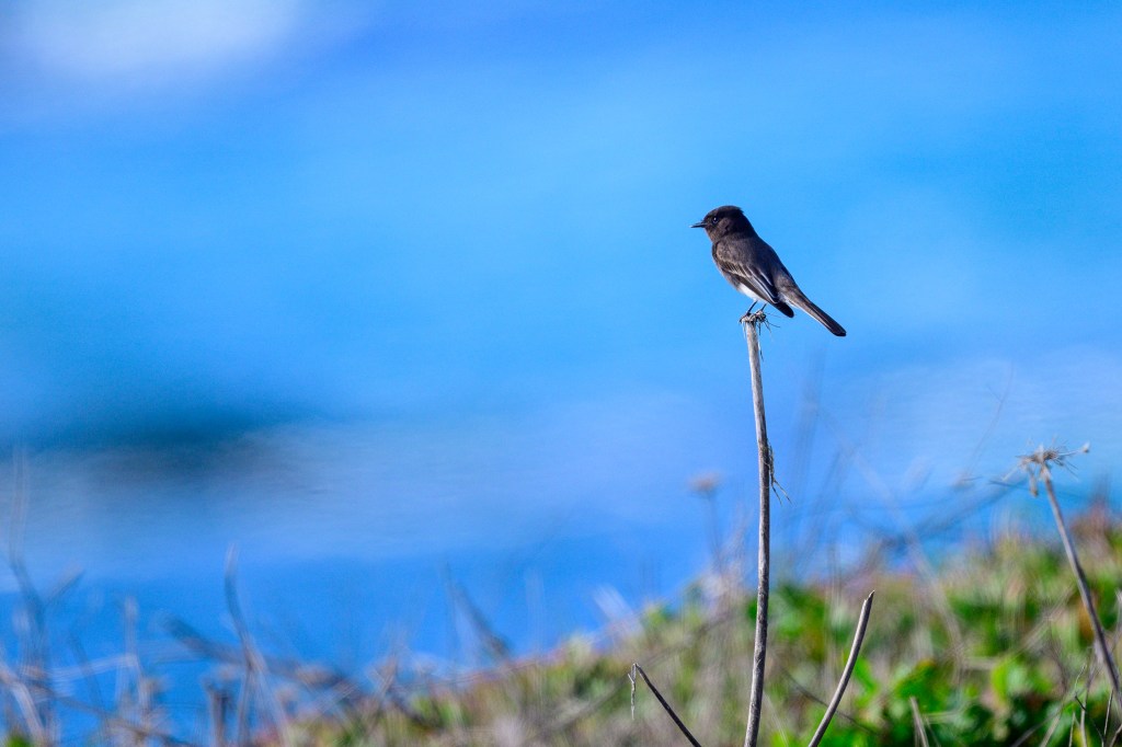 My blog is focused on birds of the Eastern Sierra, from Owens Lake to Mono Lake. But this post focuses on the coast near Fort Bragg, about half-way between San Francisco and Oregon. The geography here is simple: from west to east is the Pacific ocean, then a shallow shore with rocky islands, sometimes a strip of beach, followed by cliffs topped by flat headlands. Then the earth rises into low coastal mountains that are covered by wet forests. Fort Bragg lies on a narrow stretch of flat land between the ocean and the forests.