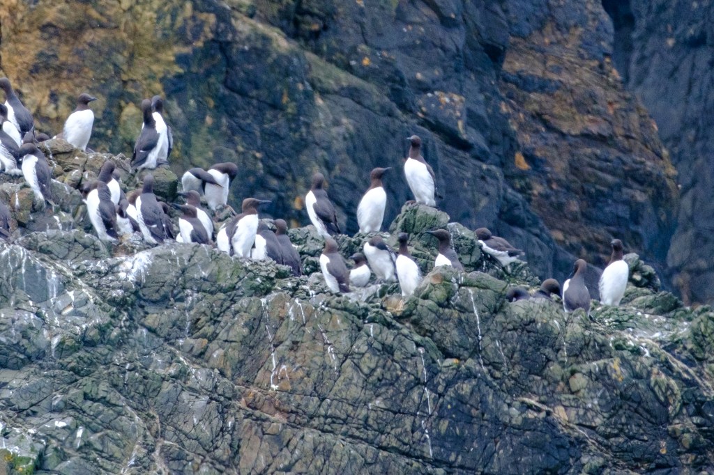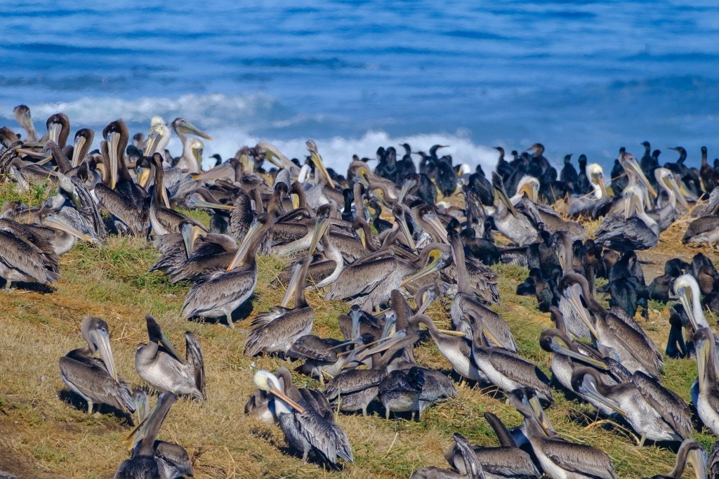 There were probably 100 Pelicans in the scene below and maybe 1000 more on nearby bluffs. The black birds on the right are Pelagic Cormorants. A few Western Gulls, very white, are scattered about.