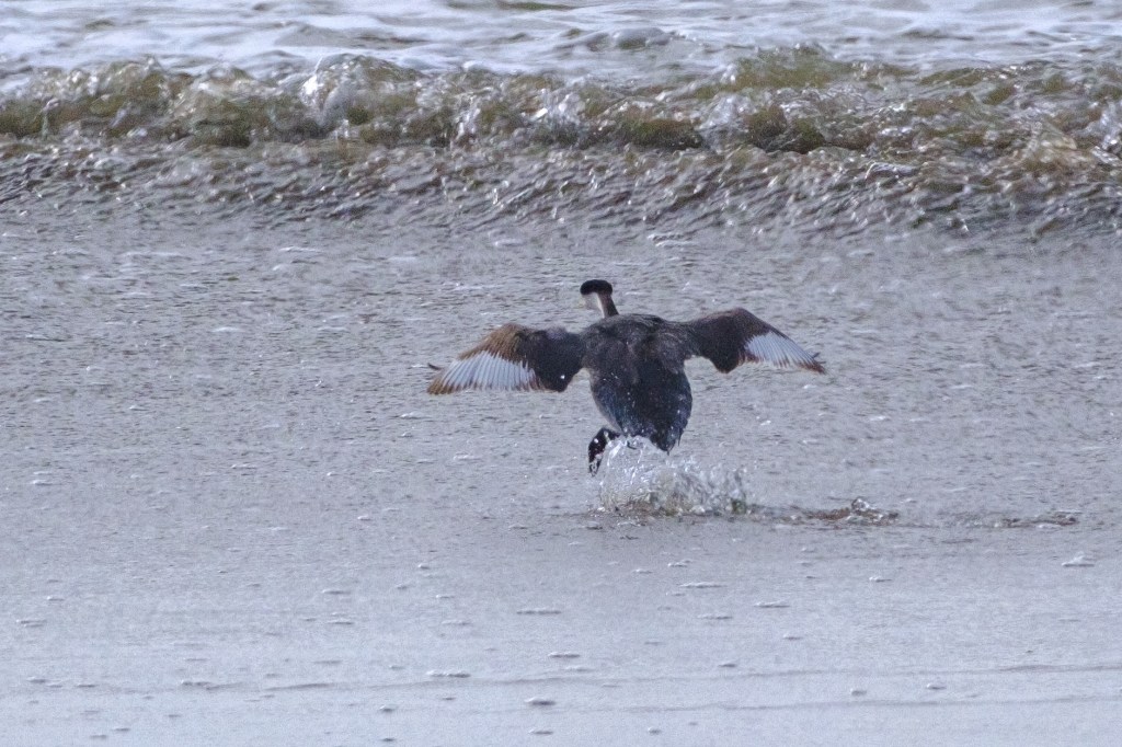 Western Grebes are famous for doing a water dance. A mating pair will join each other in “walking” on the water surface. The bird below was single, but practicing this dance in the surf.