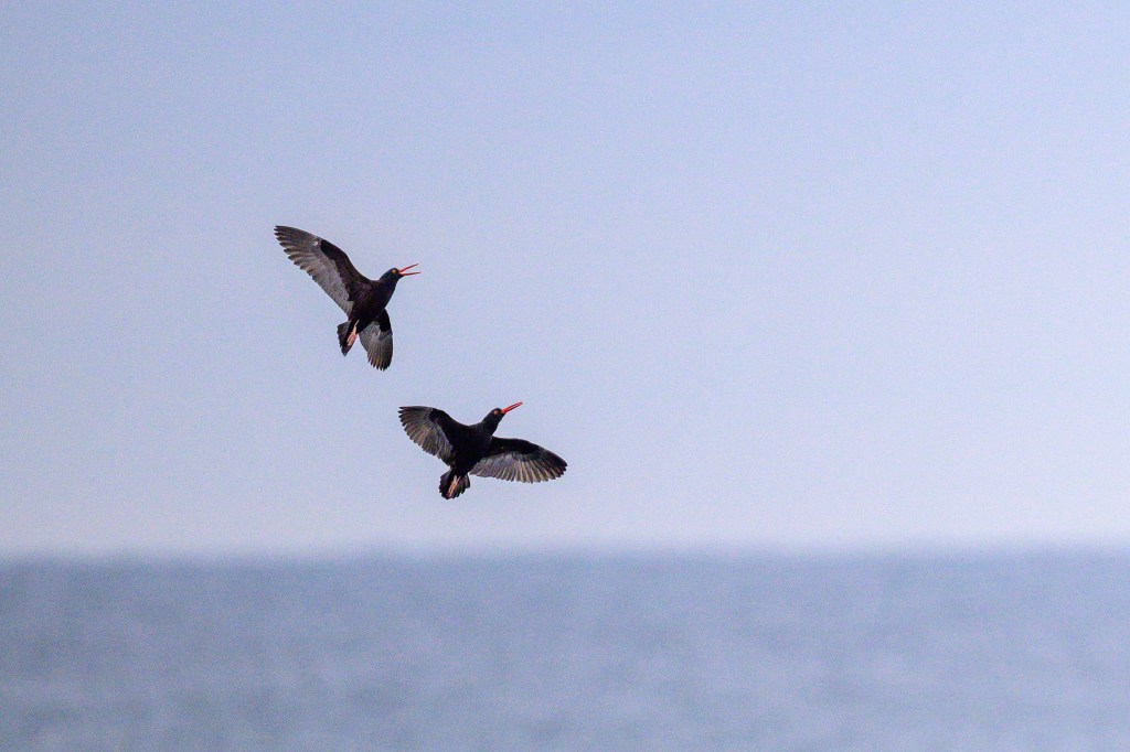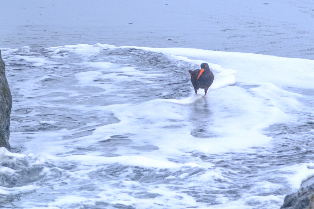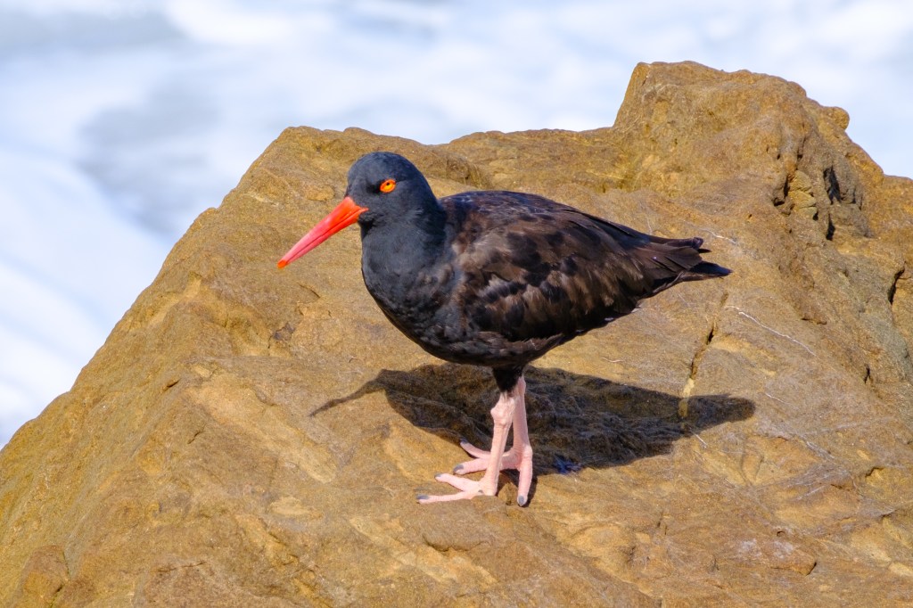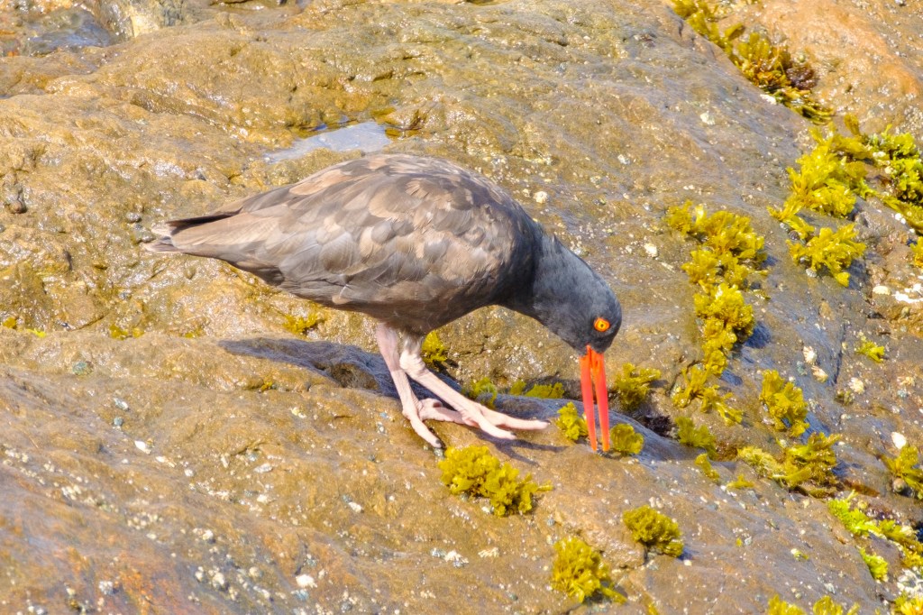 Clownish in appearance, with yellow eye, red eye-ring and bill, dark feathers, and pink legs. Toes seem to have toenails. A bird created by a comedian. They can chisel mollusks off rocks and then pry the shells open.