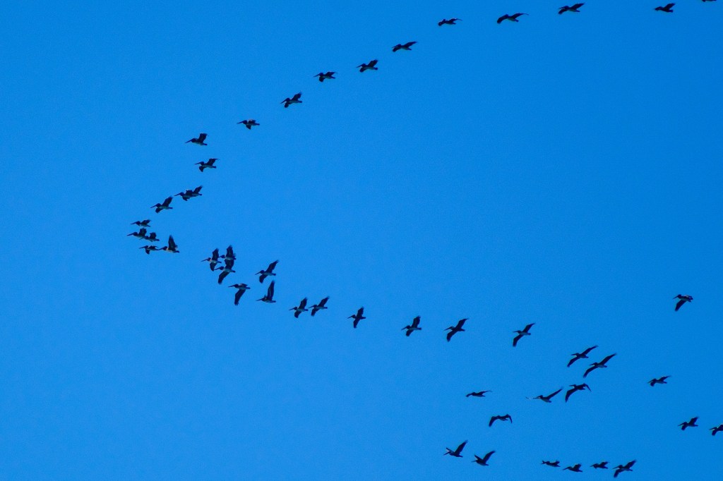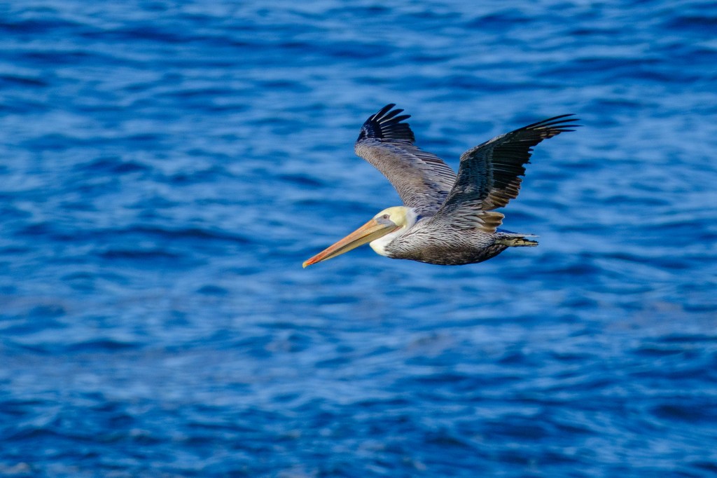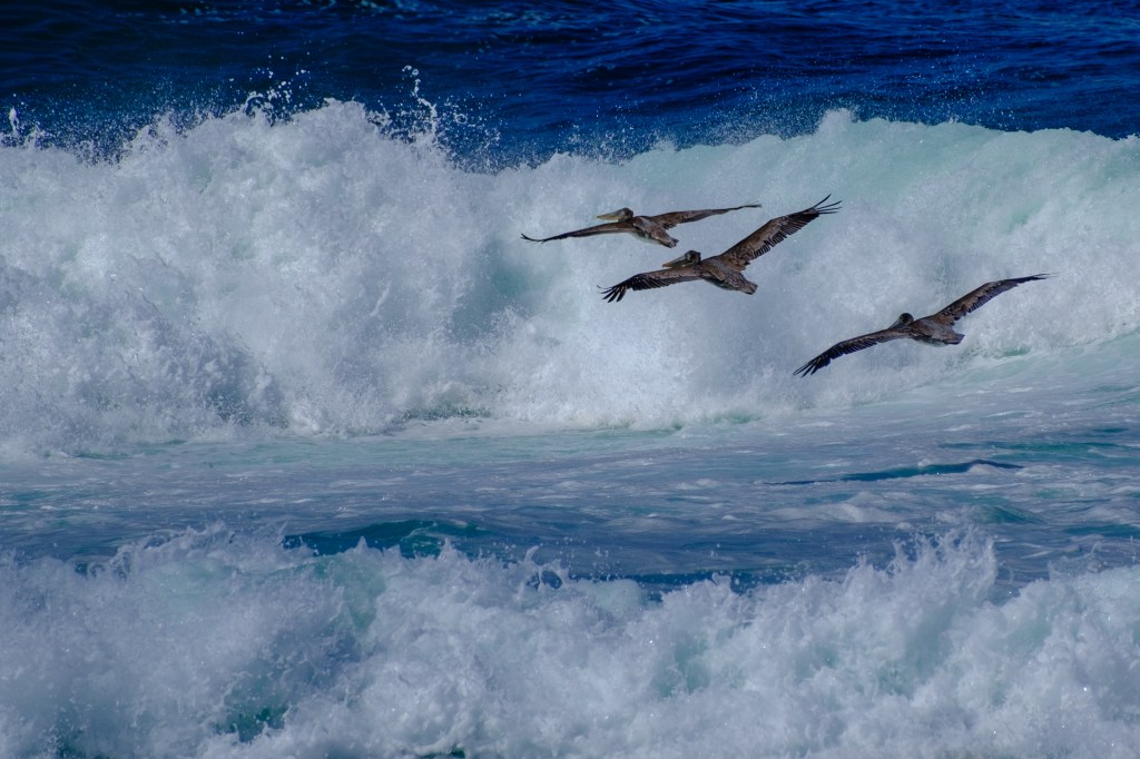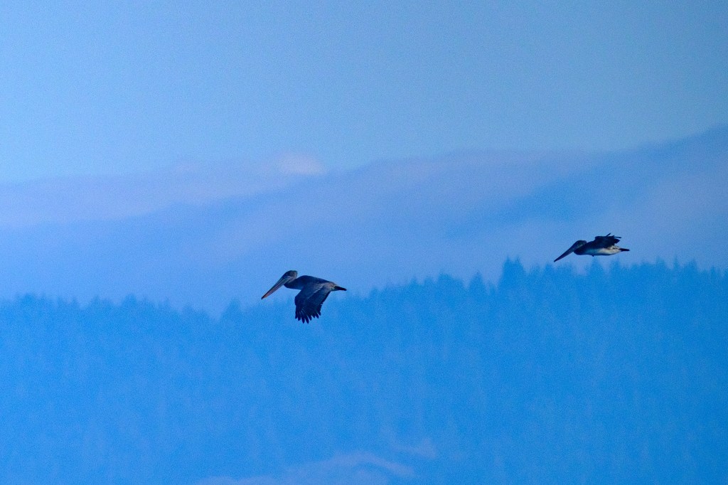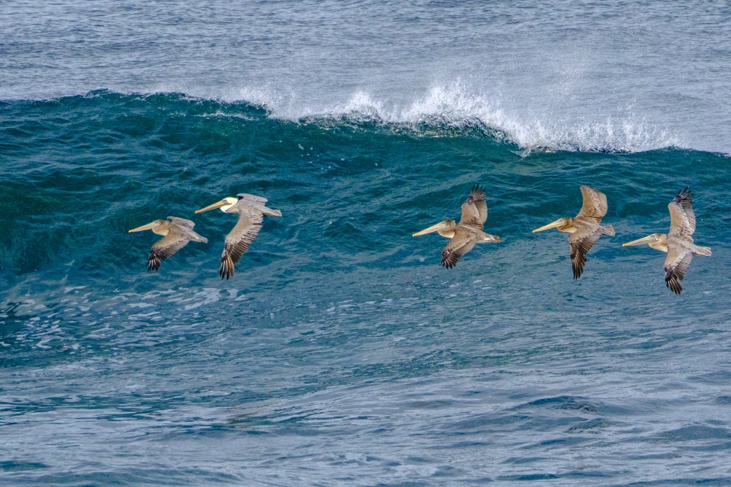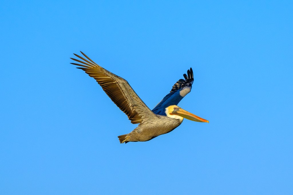 Decimated by DDT in the 60’s, populations have recovered. Weight 8 lb, wingspan 6.5 feet. Awkward on land, but graceful aeronauts. When they plunge-dive for fish, their beaks can fill with 10 quarts of sea-water. Easy to identify; no other creature looks like this. Easy to photograph in the air because of they are so big and they have a predictable flight path; a few wing-beats lift them up, then they glide down, then up again, with little change in direction. The Brown Pelicans are birds of the coast and the Mississippi River valley. (In the Owens Valley, we have the much bigger American White Pelican; weight 16 lb, wingspan 9 feet.)