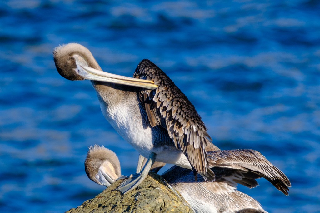 On land, Pelicans obsessively preen their feathers. Occasionally one takes off, flies over the waves, and lands again in a different spot. Are they just visiting other Pelicans? Are they testing their feathers, checking if the preening is satisfactory? There are hundreds of them in the area in fall, but they vanish in winter. These photos were taken at the Mendocino Headlands in the fall.
