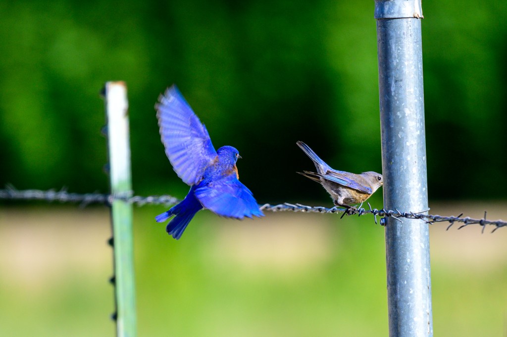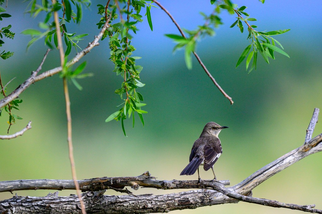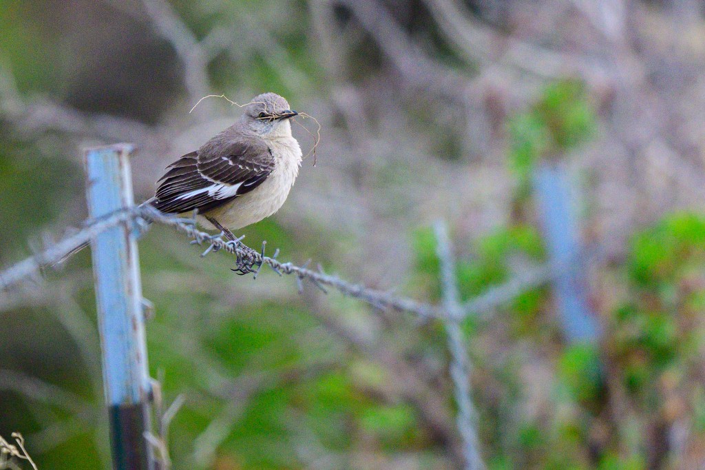 Northern Mockingbirds are common along the fence line of Gus Cashbaugh Lane. The second photo shows a bird with nest-building material in its beak.