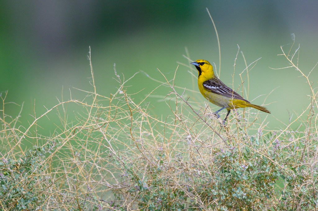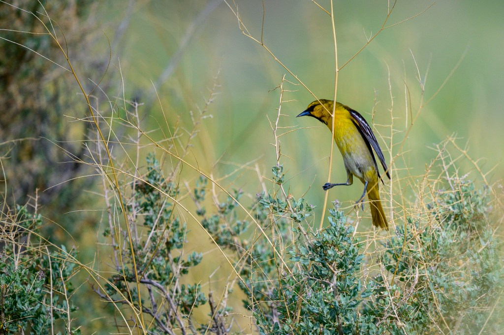 A Bullock’s Oriole does a balancing act on some vegetation.