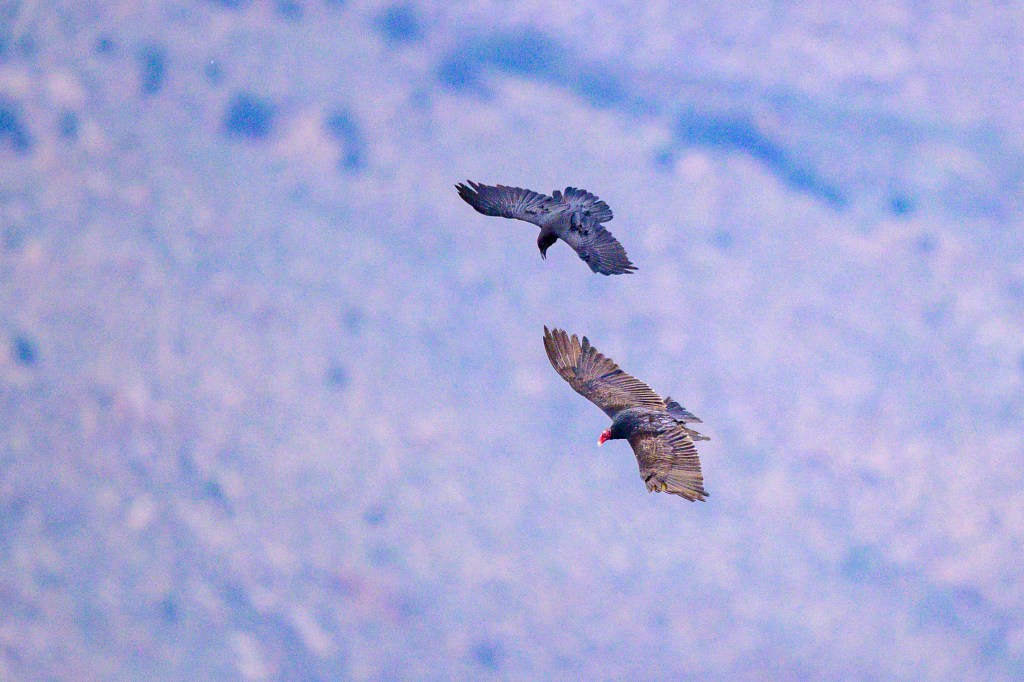 Ravens and Crows often harass other birds. Below a Common Raven torments a Turkey Vulture with the Sierra in the background.