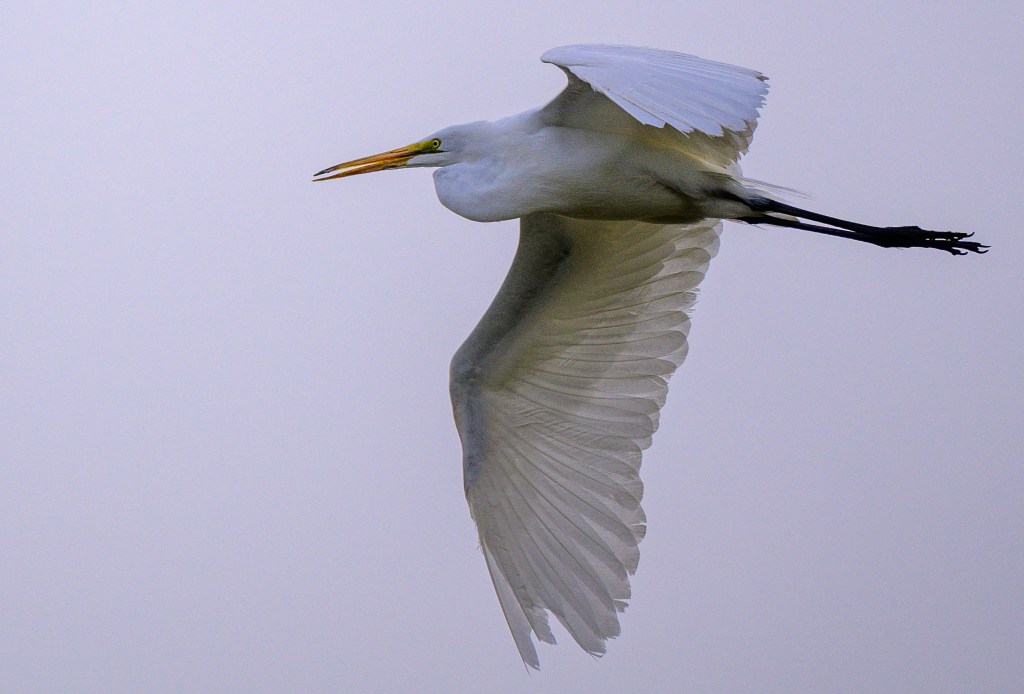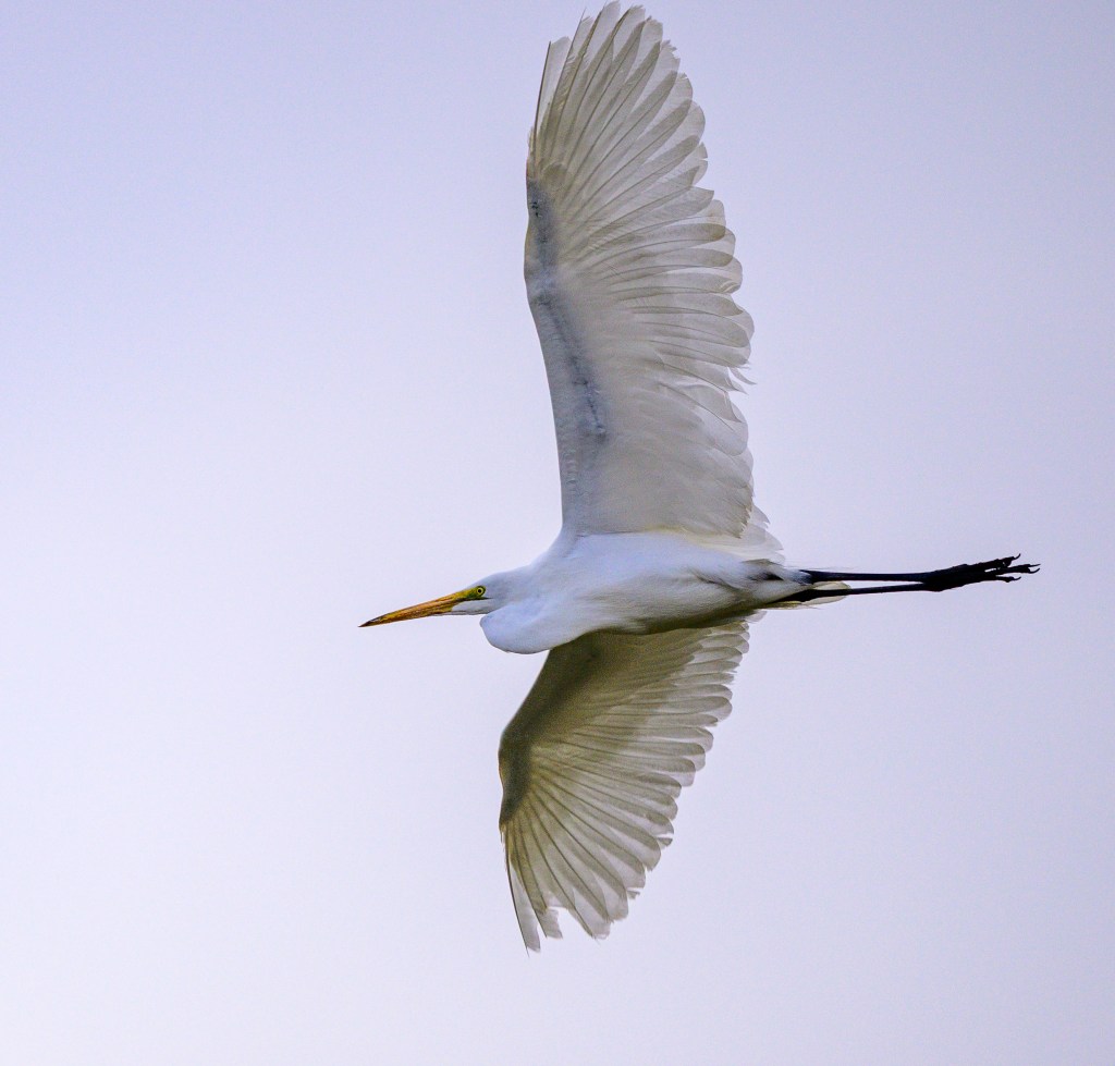 I have many photos of Great Egrets in flight, but the pictures below were unusual. The sky was a bit overcast and the bird flew in front of darker clouds; this lighting made the wing feathers unusually translucent. Near the leading edge of each wing you can see some of the bone structure.