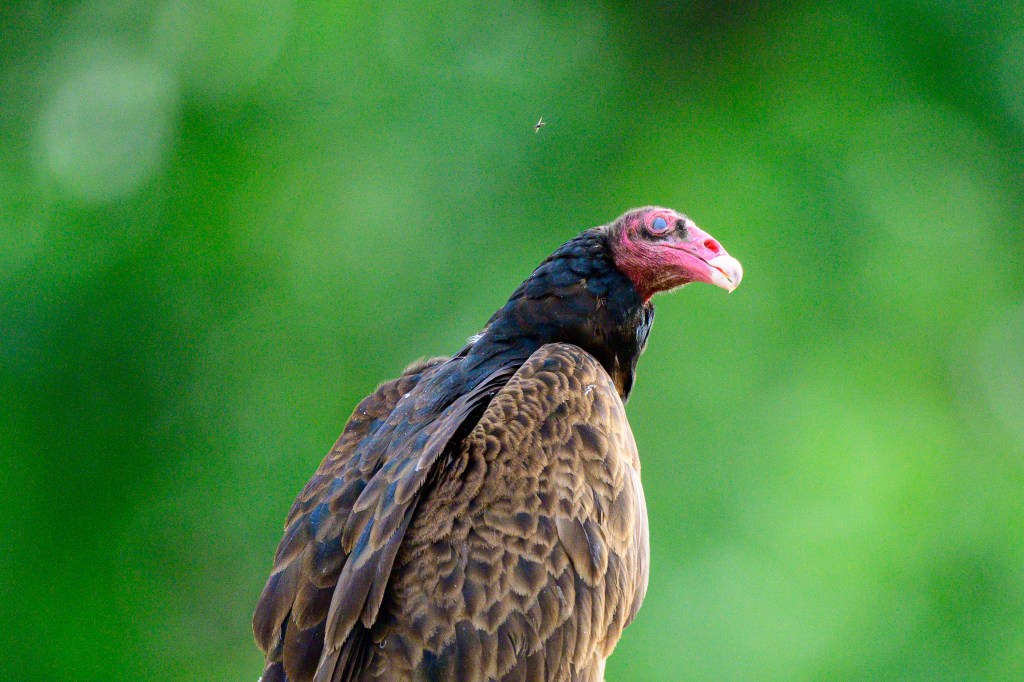 A Turkey Vulture was perched near the road. A bug (fly?) passed over the Vulture’s head and the Vulture turned to look at the bug; you can see this flying bug in the picture. The Vulture rolled its blue nictitating membrane over its eye, possibly for protection.