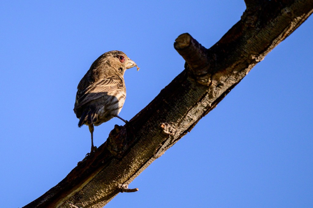 Below is a female House Finch. Her eye is swollen, red, and bulging. Her conjunctivitis is likely due to Mycoplasma gallisepticum, a bacteria that often infects poultry. This disease first appeared among House Finches in the mid-Atlantic states in 1994 and killed off about half of the House Finches in the area. The illness moved west, reaching California House Finches in 2006. Birds die due to lose of vision; they cannot feed themselves and are killed by predators. Will this bird survive her illness?