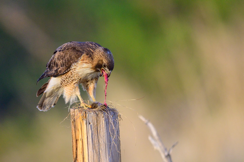 A Red-tailed Hawk landed on a post with a freshly caught rodent. Carnivorous birds have no teeth, so eating consists of tearing apart and choking down their prey. I used to think that if I died and could come back as another creature, I would want to be a bird. Eating like this make me reconsider that choice.